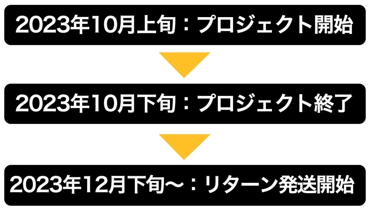 ※本文中に記載させていただいたスケジュールは、あくまでプロジェクト公開時点の予定です。クラウドファンディングの性質上、配送遅延のおそれがございます。