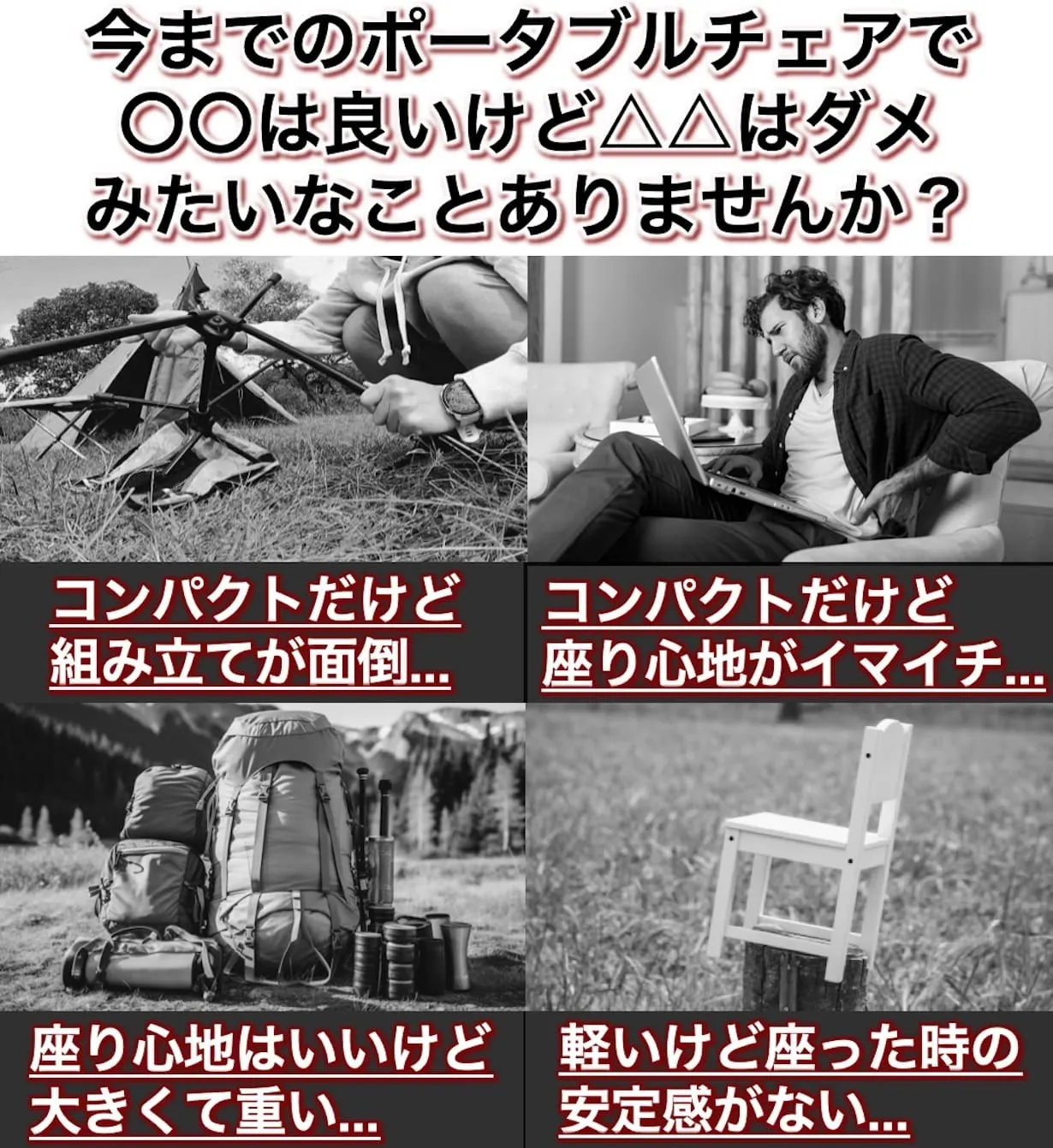 私自身アウトドアや夏フェスなどが好きで、今まで自分の求める理想的なポータブルチェアを求めてまいりました。