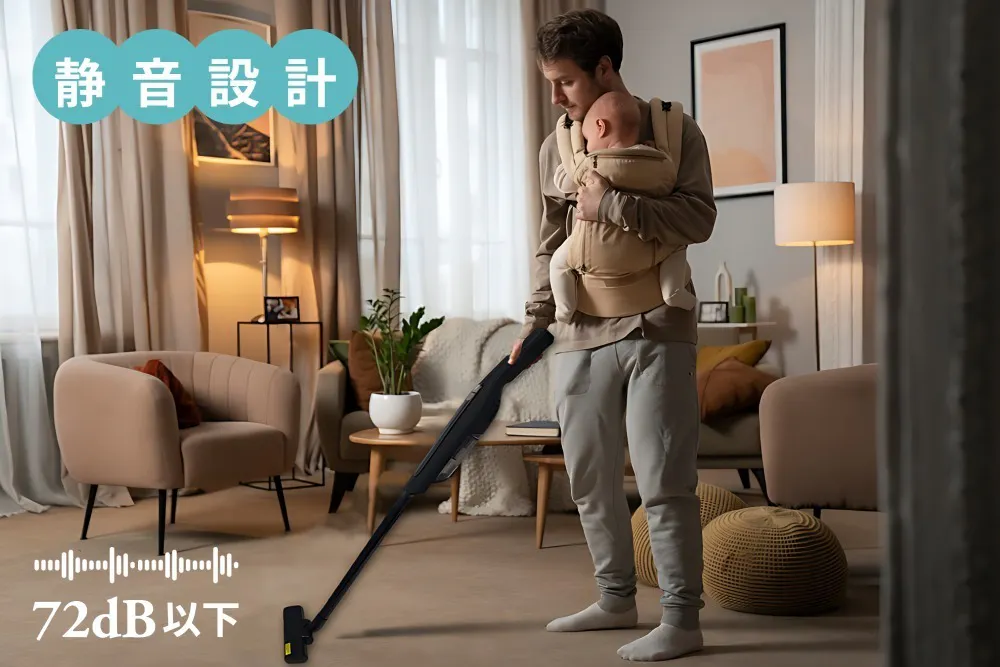 さらに、この掃除機は静かです。ハイパワーモードでも72dB以下、ノーマルモードでは68dB以下の騒音レベルで、家族やペットを驚かせることはありません。調整ボタンで強弱を切り替え、状況に応じた掃除ができます。