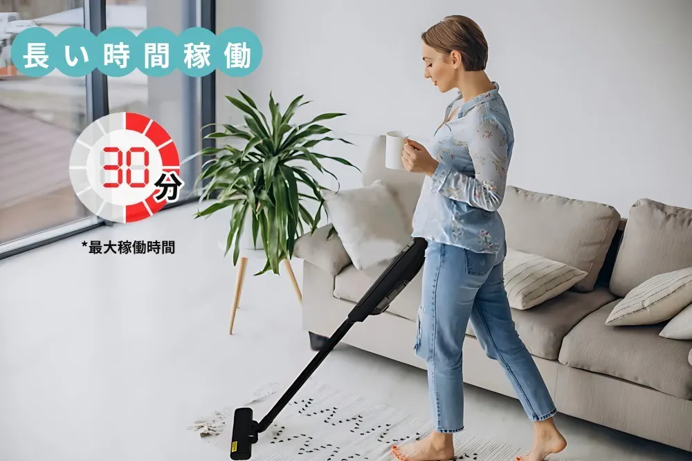 最大稼働時間:最大連続使用時間は約30分です。スぺシャルセット:広範囲な掃除が可能なアタッチメントが付属します。