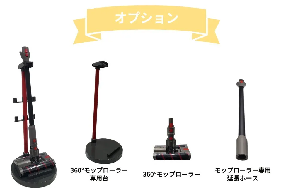 今回オプションとしてヘッドが360°回転するダブルローラーブラシ、専用延長ホース、専用の立てかけ収納代、アタッチメント置きをご用意しております。