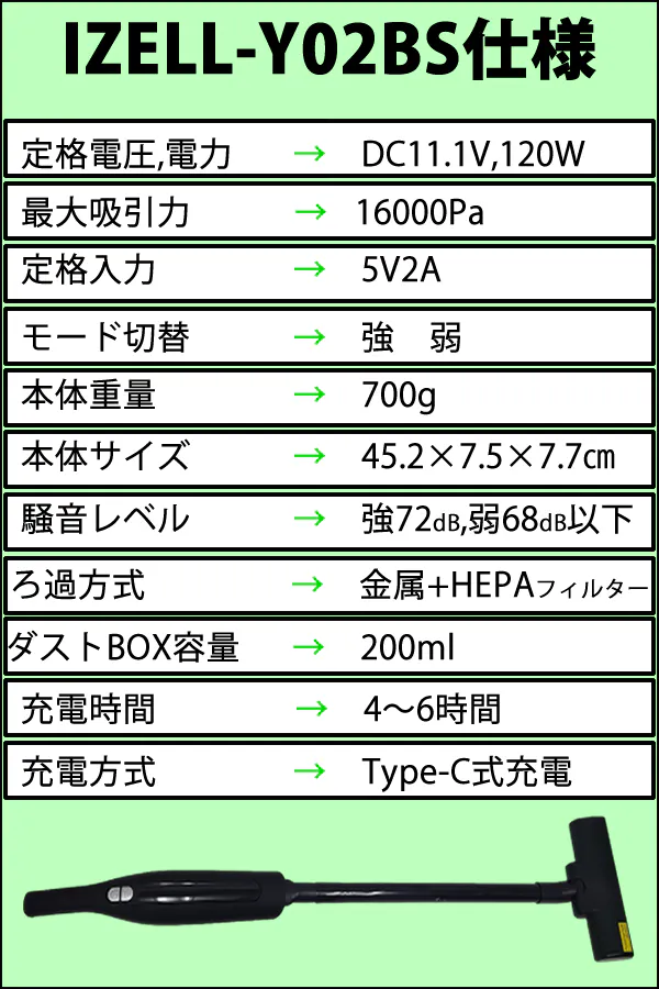 IZELL-Y02BSはあなたの家庭の掃除を楽にし、清潔な空間を手軽に維持する可能性を持つ優れたコードレスハンディ掃除機です。多くの特徴を持ち、便利な機能が多数!長時間連続使用が可能で、軽量設計により、疲れにくく持ち運びも簡単です。また、繰り返し洗えるHEPAフィルターを搭載しいつでも清潔に保てます。