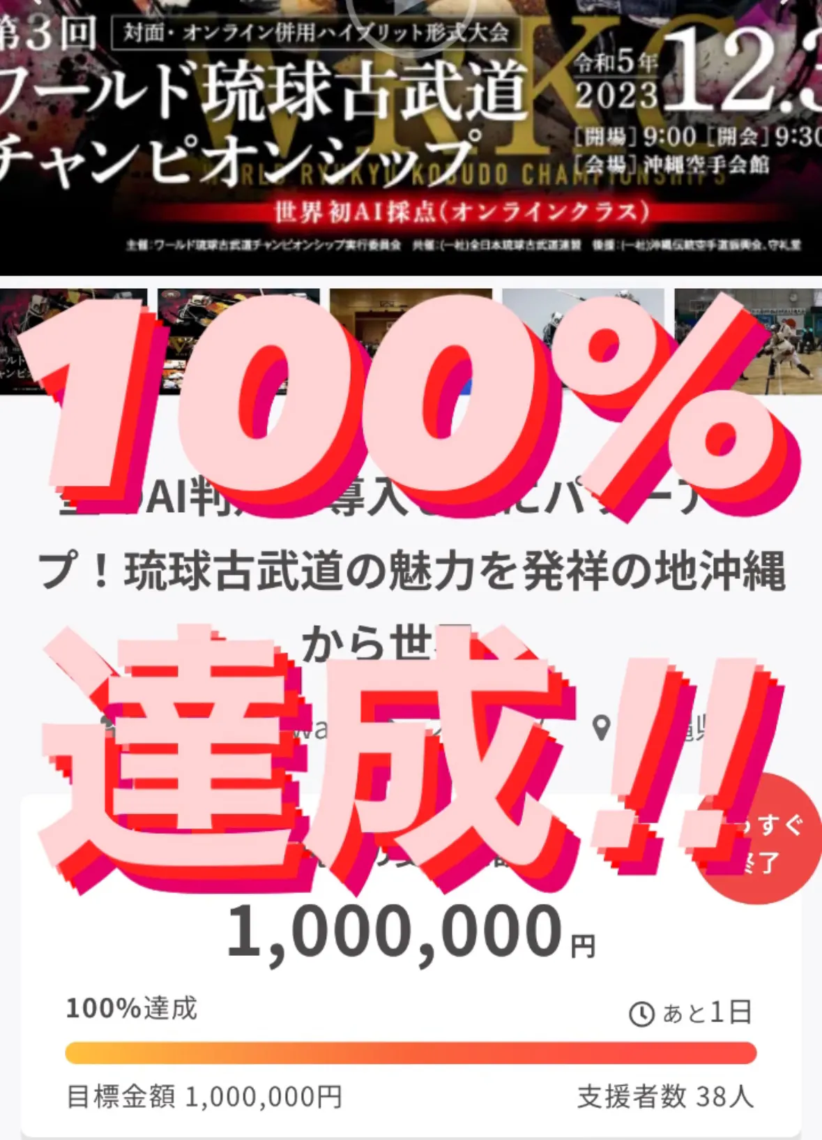 皆様の温かいご支援のお陰で目標金額100%達成しました!誠にありがとうございます!残り1日まだご支援可能です。大会成功に向けてよろしくお願いします!