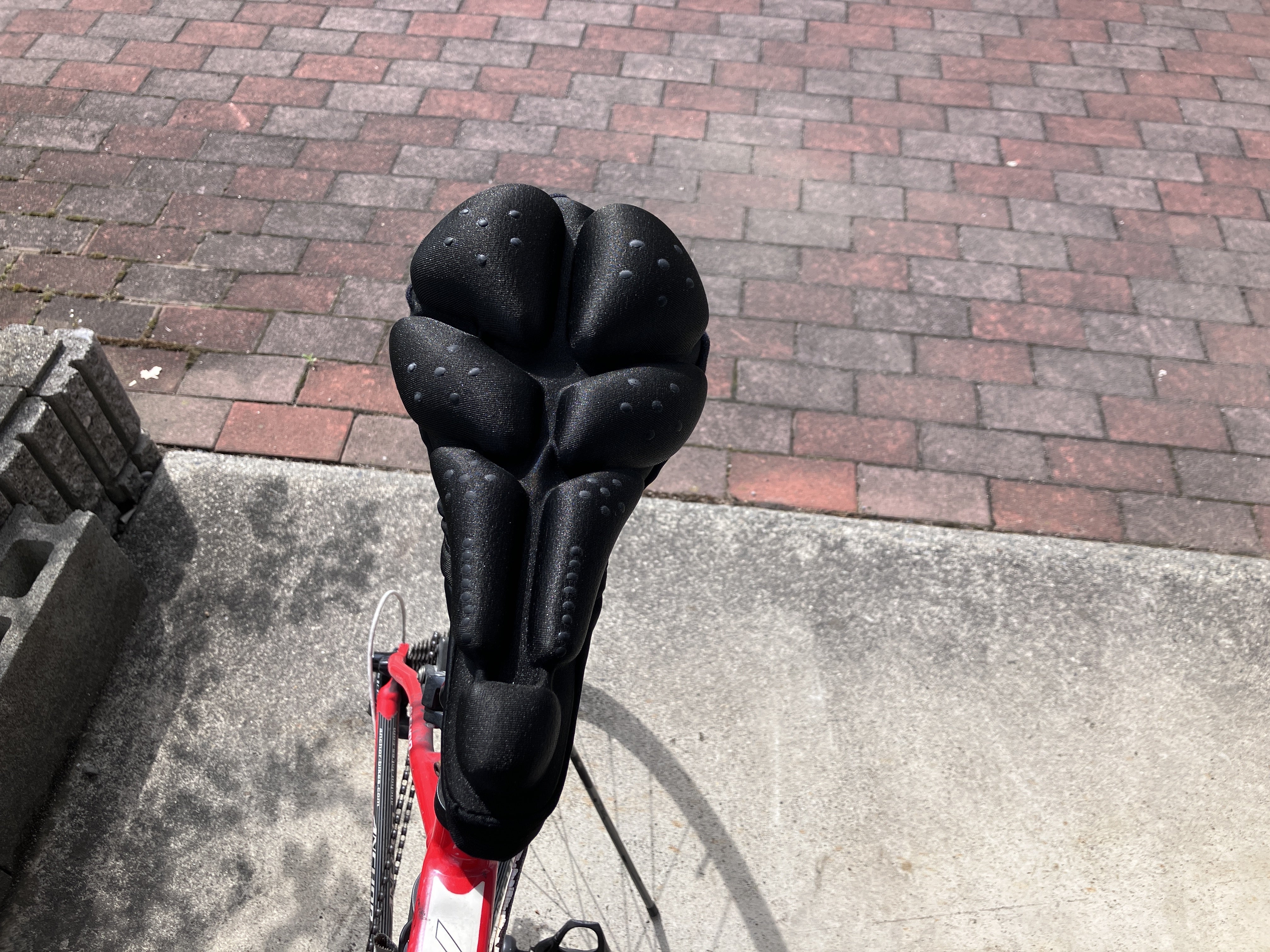 下記写真が、ママチャリ専用の通勤快尻をスポーツタイプのサドルに取り付けた状態です。少しゆるいのでズレてしまうと思われます。