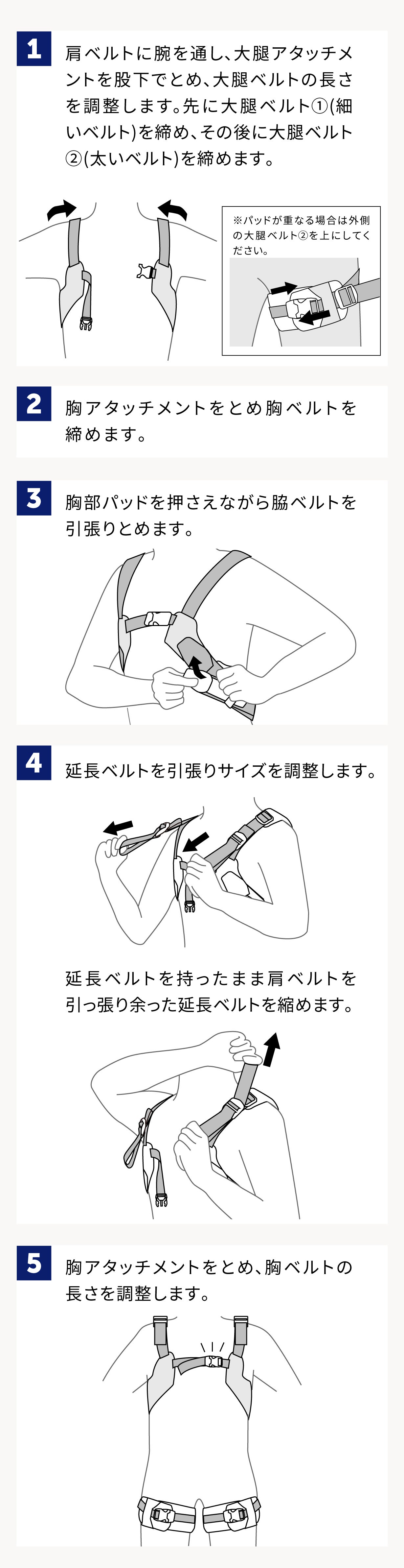 「手が肩まで届きにくいからベルトを引っ張るのが大変」