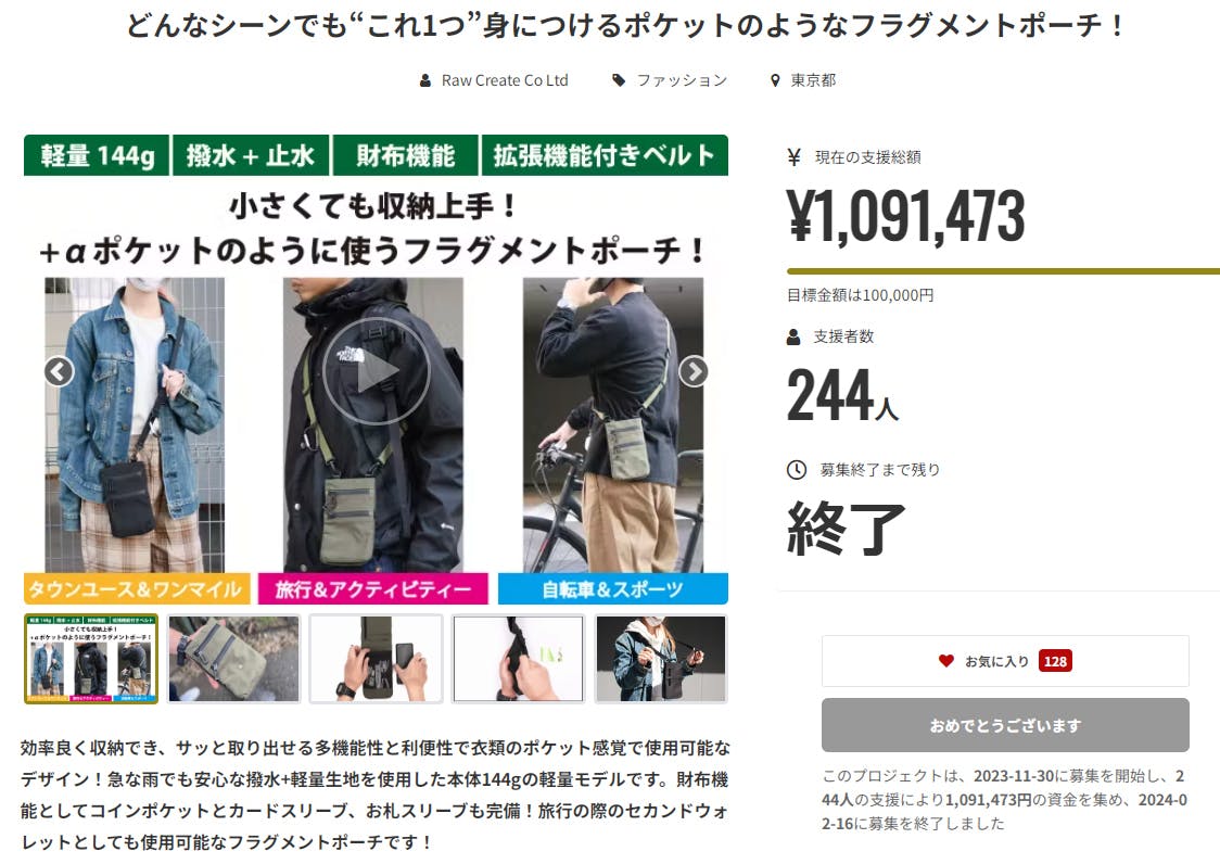 2023/12/25 20:00ご支援くださった皆様、お気に入り登録してくださってる皆様、ご閲覧いただいた皆様、本当にありがとうございます!お蔭様で達成率は200%を超えています、これも皆様の応援のおかげです!引き続き、活動報告やインスタグラムなどをご覧頂き楽しんでもらえるよう、務めて参りますので、応援の程よろしくお願い致します!前回の登山での使用に続いて、今回はロードバイクでのサイクリングでフラグメントポーチを使用してみた感想を簡単にですが、書かせて頂きます!※さらなる詳細を見たい方は弊社BLOGをご覧ください!ロードバイクでの使用感は、率直に言ってとても使い易かったです!その理由は、バックポケットにポーチ自体が収まるので、自転車を漕いでいても、ズレてこない!ベルト長を調整してポケットに収めると、バッグを付けている事を忘れる事があるくらいでした!そして、ショルダーベルトのループが鍵を引っかけるのに便利過ぎました!またトップチューブバッグとしての可能性も見いだせました!※固定にはショルダーベルトを使用する予定でまだ完全ではありませんが。。マグネット開閉式なので、取り付けもラクですし、アイデア次第で使い方の幅が広がっていくのは使っていて楽しいと思います!弊社ブログではさらに詳しくレポートしていますので、是非ご覧いただければと思います!弊社ブログはこちら→こんなところをもっと詳しく知りたいよとかこの部分のアップ画像が見てみたいなどご要望があれば、お気軽にコメント下さい!まだまだプロジェクトは続きますので、色々なシーンでの使用や、コーディネイトのご紹介等々、活動報告、SNS、ブログにて公開していきますので、引き続き、応援の程よろしくお願い致します!STAFF 一同 もっと見る