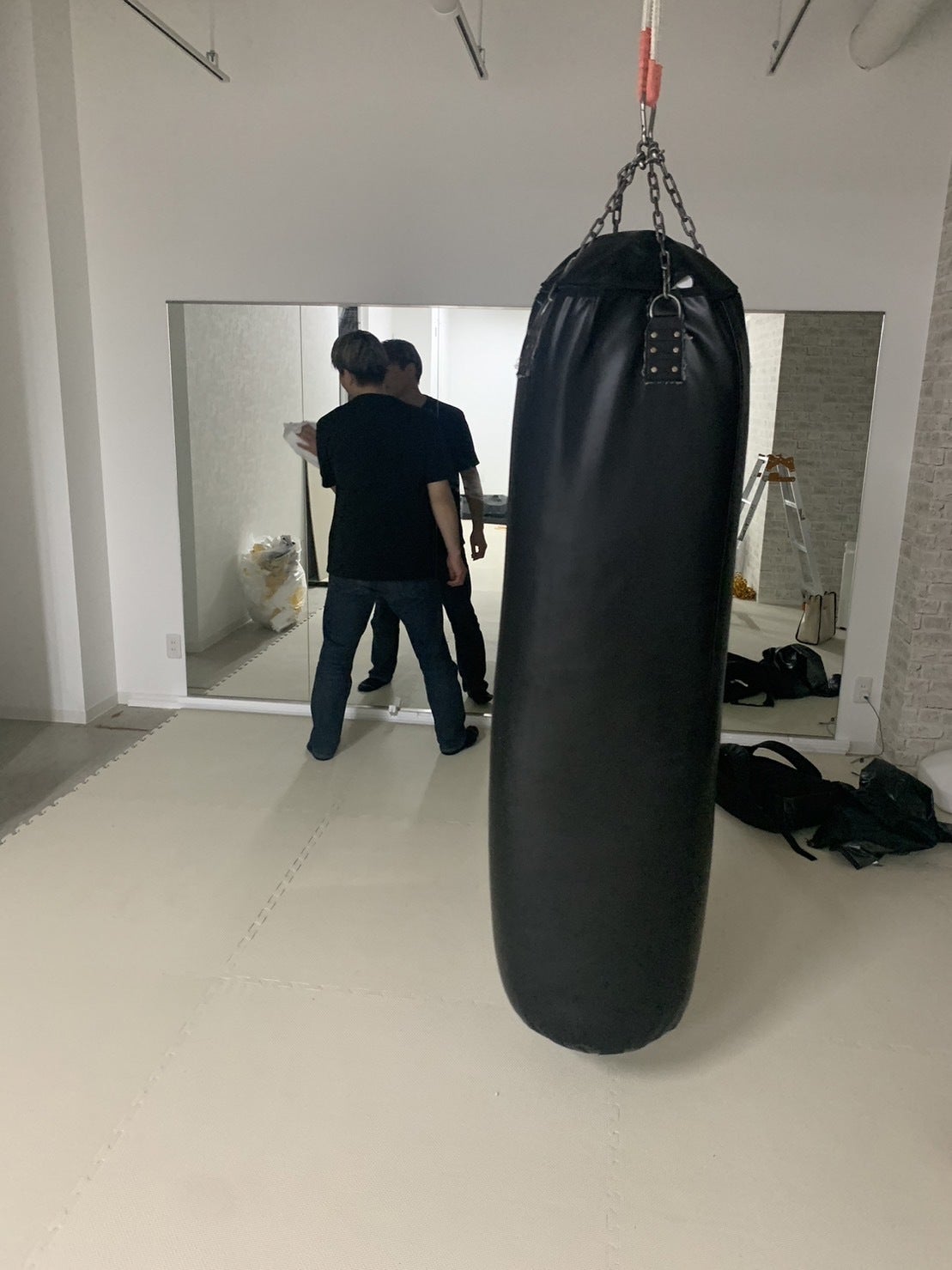 鏡はオーナーと成増店のトップトレーナーの安西さんに手伝ってもらい設置していきました。