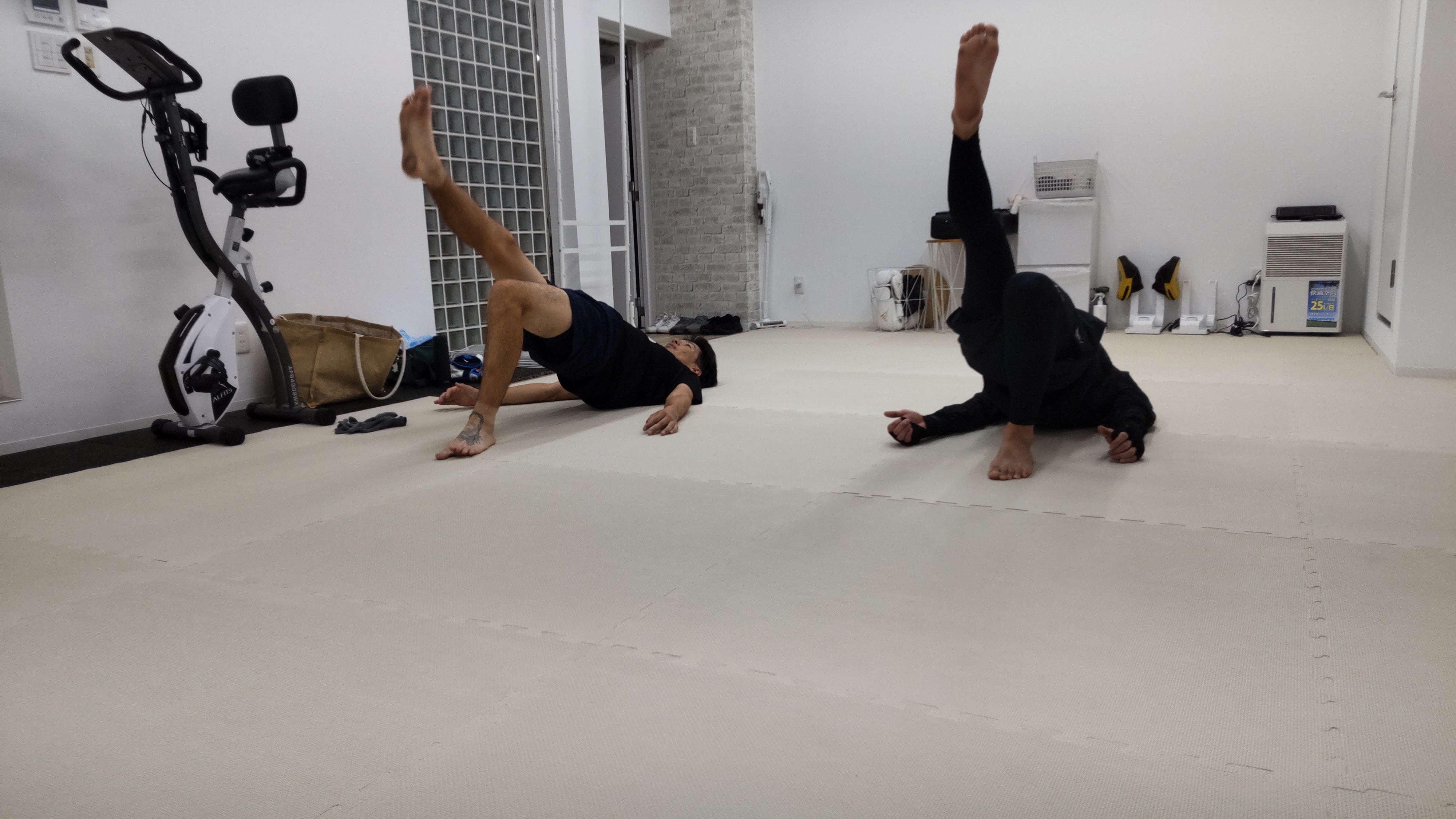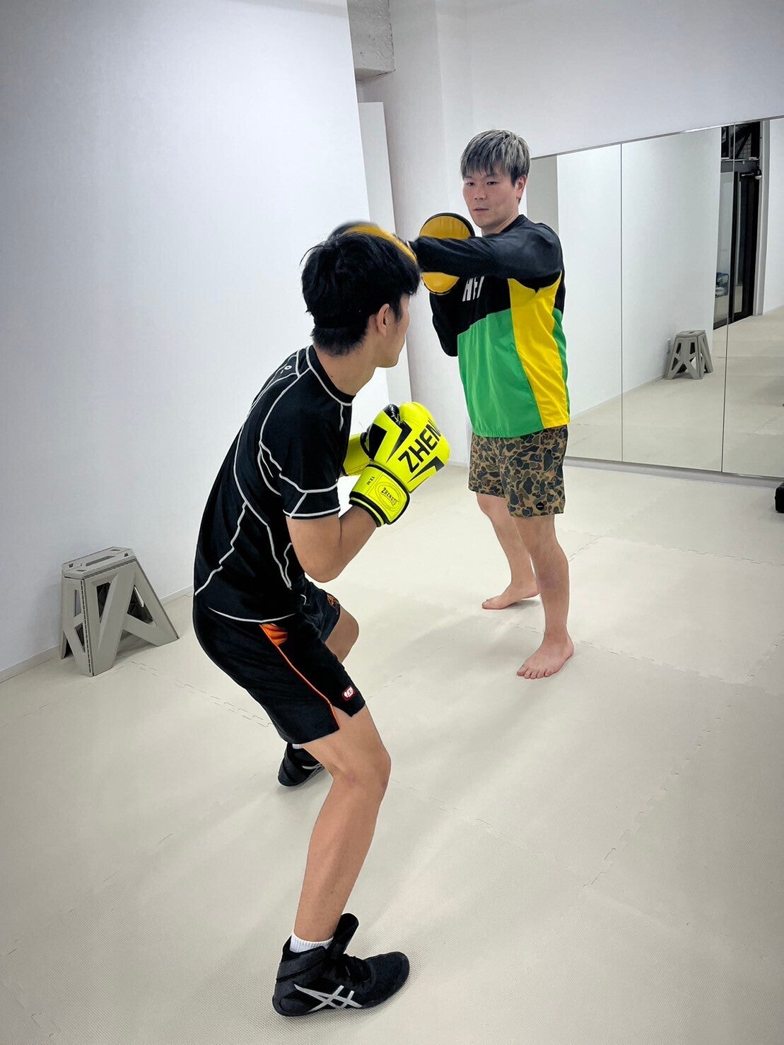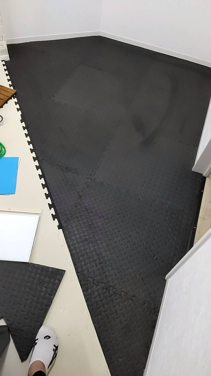 輸送の問題でリング、サンドバッグ、マット等が遅れているため、マットは仮のジョイントマットを敷き詰めました。