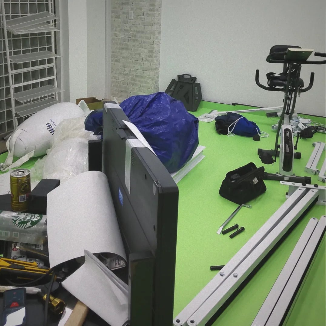 鉄骨やリングの組み立てをしている時にマットを敷いてからでないと鉄骨やリングを動かせなくなってしまうことに気が付き、マット敷きに変更!