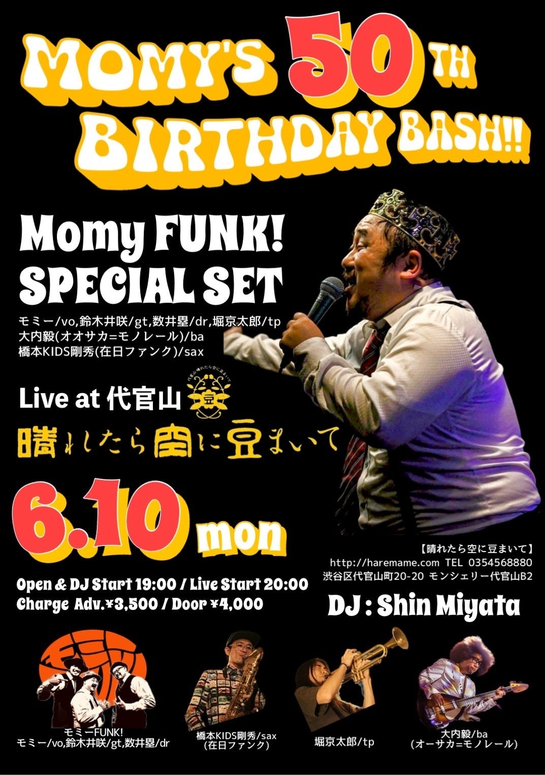 そして、6月10日(月)、おかげ様で満50歳になります。そんな誕生日当日、代官山 晴れたら空に豆まいて にて『モミーFUNK! Special Set "Momy's 50th Birthday Bash!!!』を行います!!!