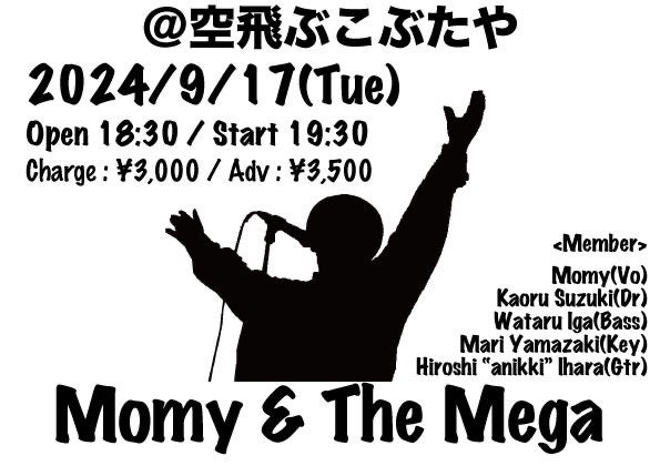 いよいよ明日9/17(火)、下北沢 空飛ぶこぶたや にて、Momy & The Mega、ライブやります!!!先月の晴れ豆でのリリースパーティー後、初のMomy & The Megaのライブです。