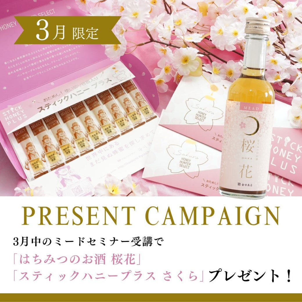 グランドオープンを記念して、3月中にセミナーにご参加いただくと「はちみつのお酒 桜花」「スティックハニープラスさくら」をプレゼント!