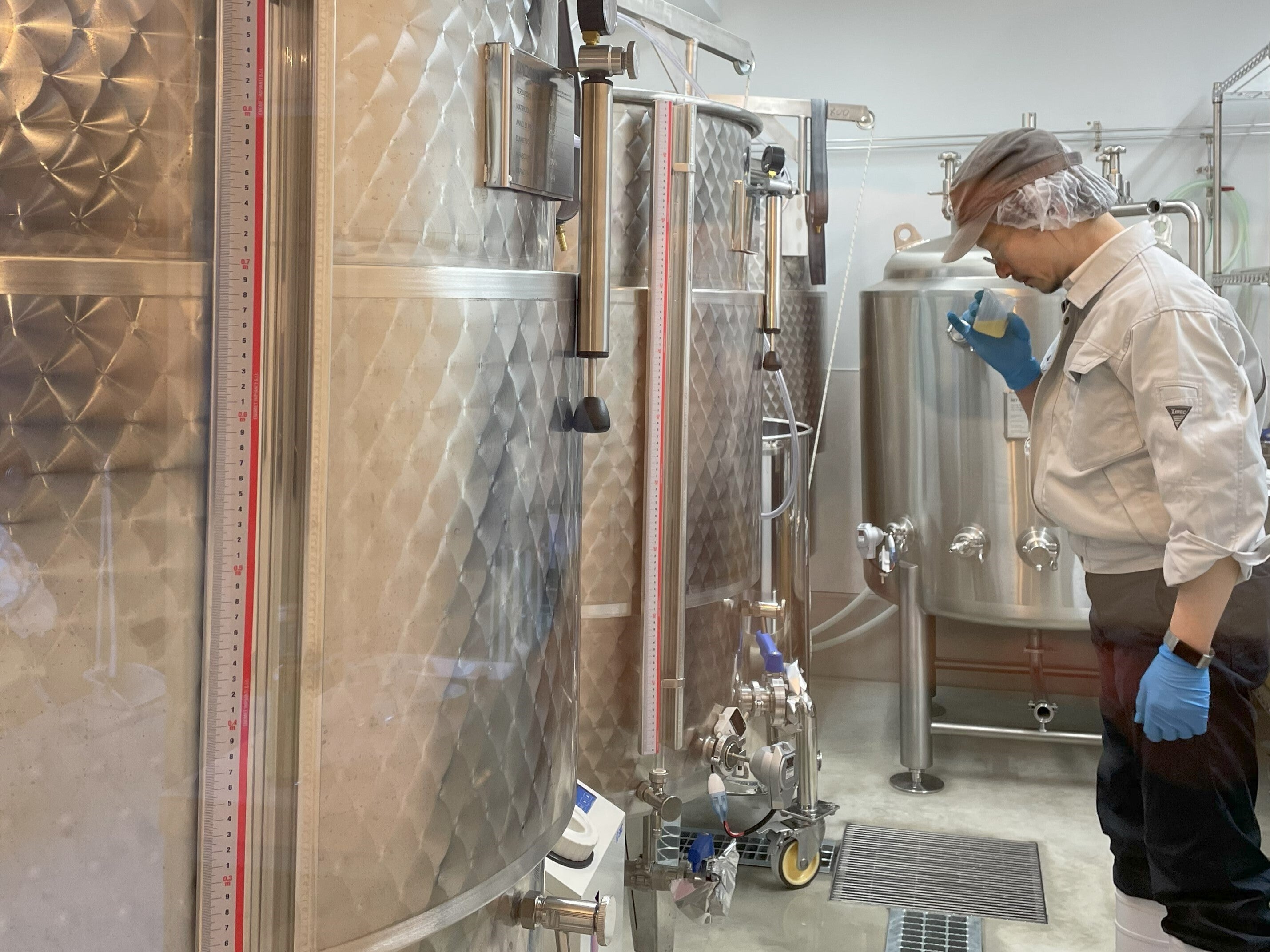 蜂蜜に水を加えた液(マストといいます)に酵母を加えた後は、タンクの中で酵母に頑張ってもらうしかないので、酵母に任せておいしいミードができるように頑張ってもらいます。とはいえ毎日、蜂蜜酒の状態を分析・検査し、目標の数値、味わいに近づいているかを確認してできあがりを目指していくわけです。日々酵母が頑張って蜂蜜酒が少しづつ出来ていくのを見守るのは非常に楽しい時間ですね。