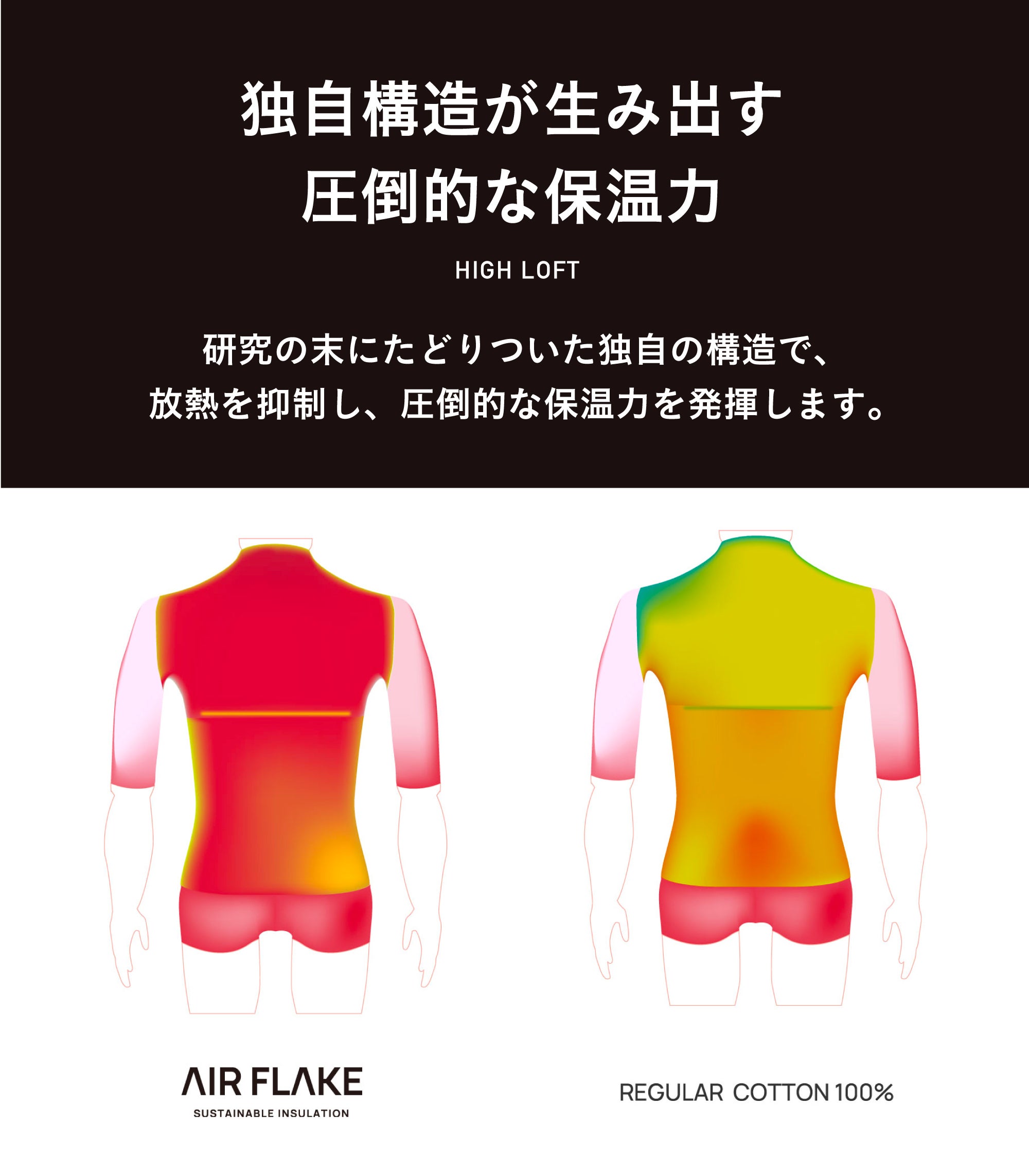 AIRFLAKE®️は、暖かな空気をたくさん含むため、化学繊維でも圧倒的な軽さでふかふかです。