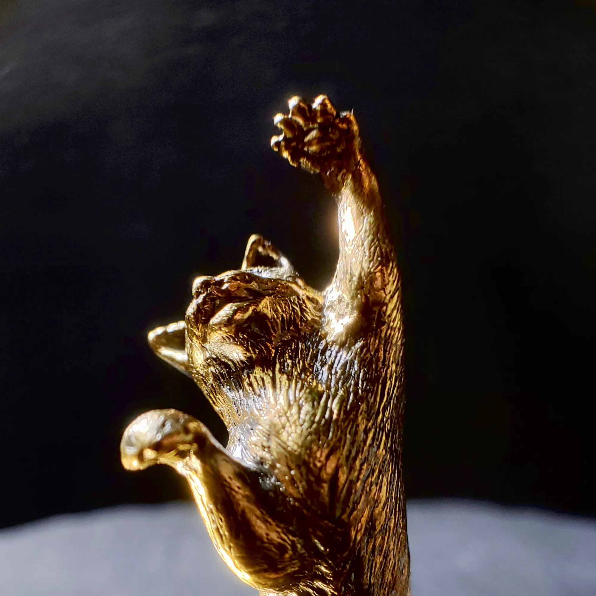 アクセサリーを作る過程で学んだ「ロストワックス技法」という熱で溶けるロウのようなものを使って造形し、それを金属に置き換える方法で猫を作り、お皿や猫じゃらしは一つ一つ手で叩いたり曲げたりして作っています。
