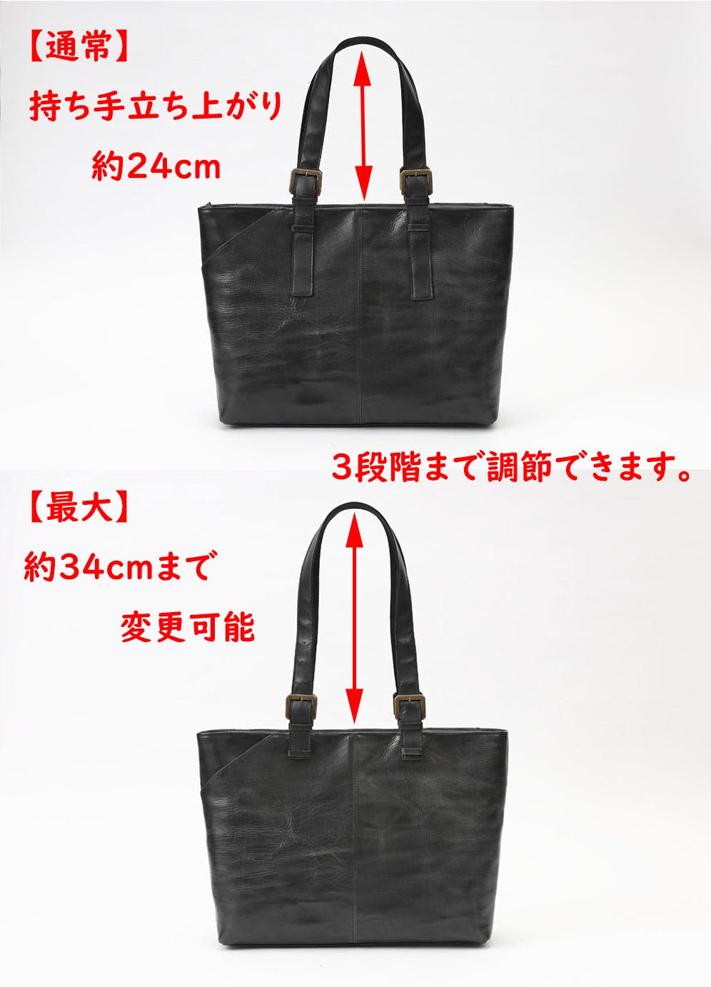 2wayバッグと言えばショルダー紐が別で付いていますが、余分な物はカットしました。このビジネスバッグは手元のバックル金具で長さを調節できる優れもので、簡単にショルダーバッグへと早変わりします。