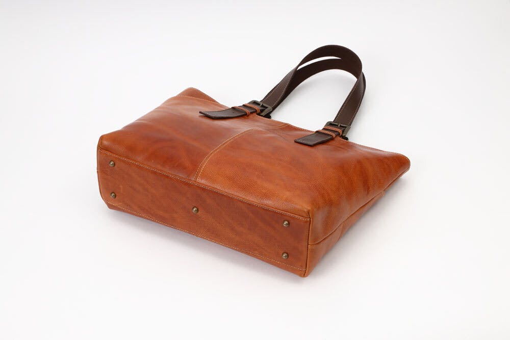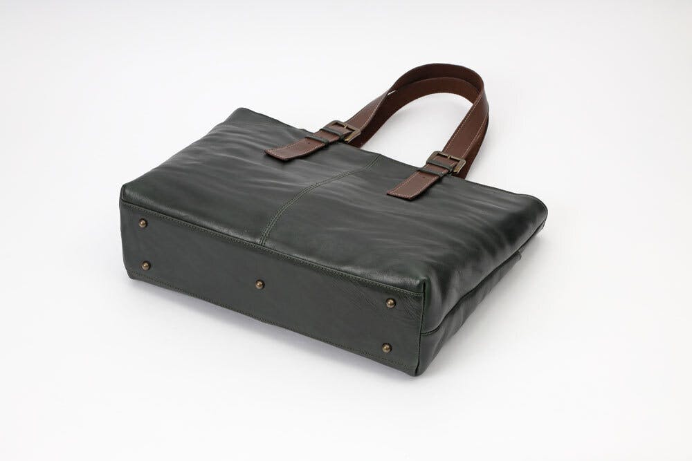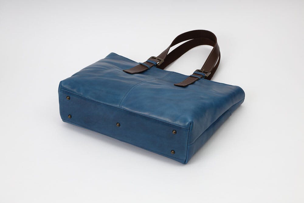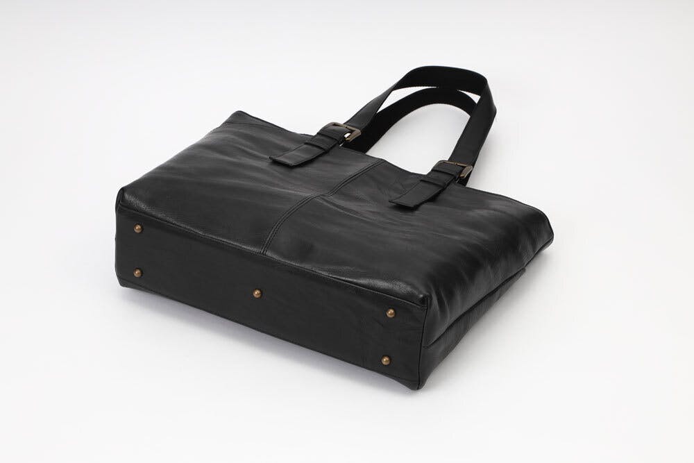 通常は底鋲は4つですが、重いものを入れたとき底の真ん中が凹み革に傷が付く恐れがあるので、底の中心にも鋲を追加しています。