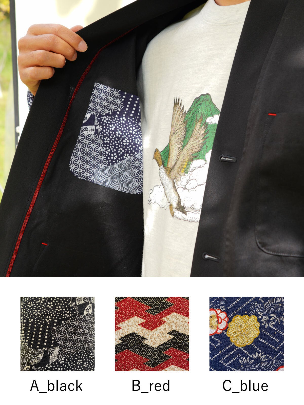 内胸ポケットと、袖先の部分に和柄の生地があしらわれています。