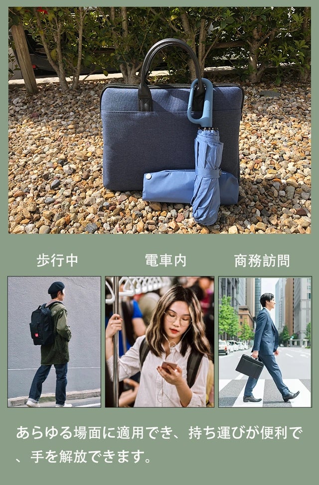 歩行中や電車内、ビジネスシーンなど、両手を解放して傘を持ち運ぶことができ、非常に便利で美しいです。