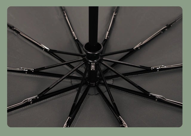 折り畳み傘の構造は10本の傘骨のハニカム補強構造を採用しており、より良い安定性と耐久性を備えています。傘骨の折り畳み部分には補強設計が施されています。傘骨の材質はガラス繊維で、強度と耐久性が保証されています。傘の中棒はアルミニウム合金で作られ、軽量で丈夫です。