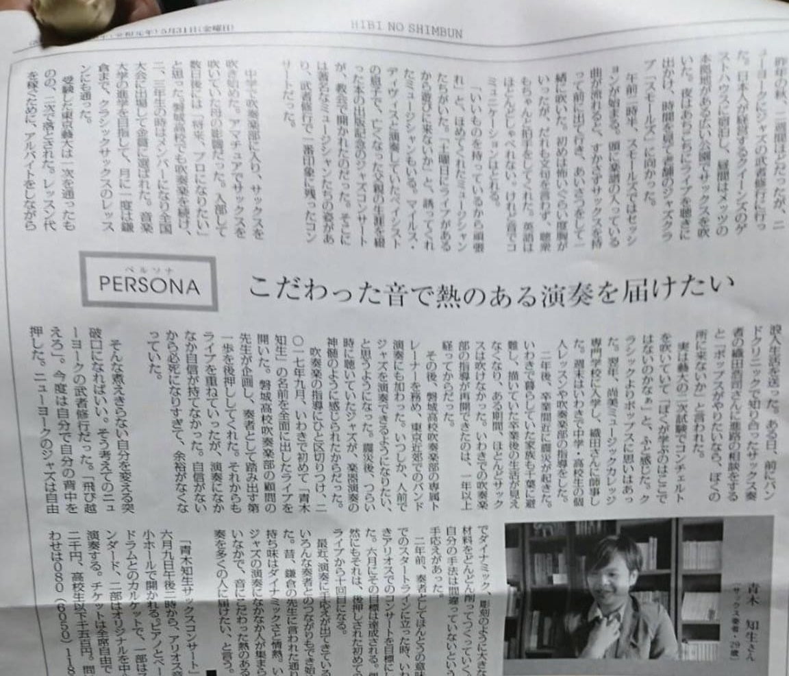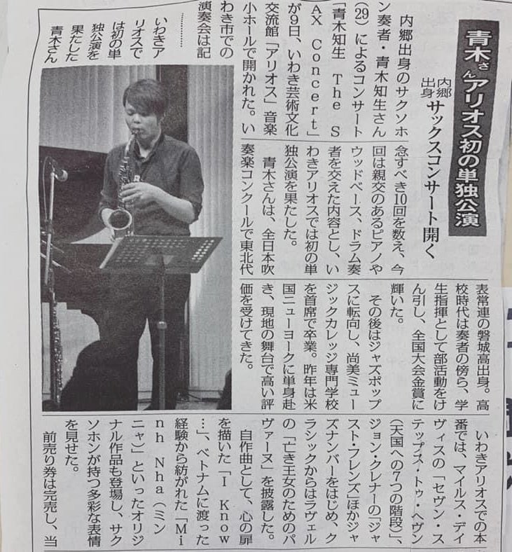 はじめまして。福島県いわき市出身で、首都圏を中心にサックスを演奏して活動している青木知生と申します!