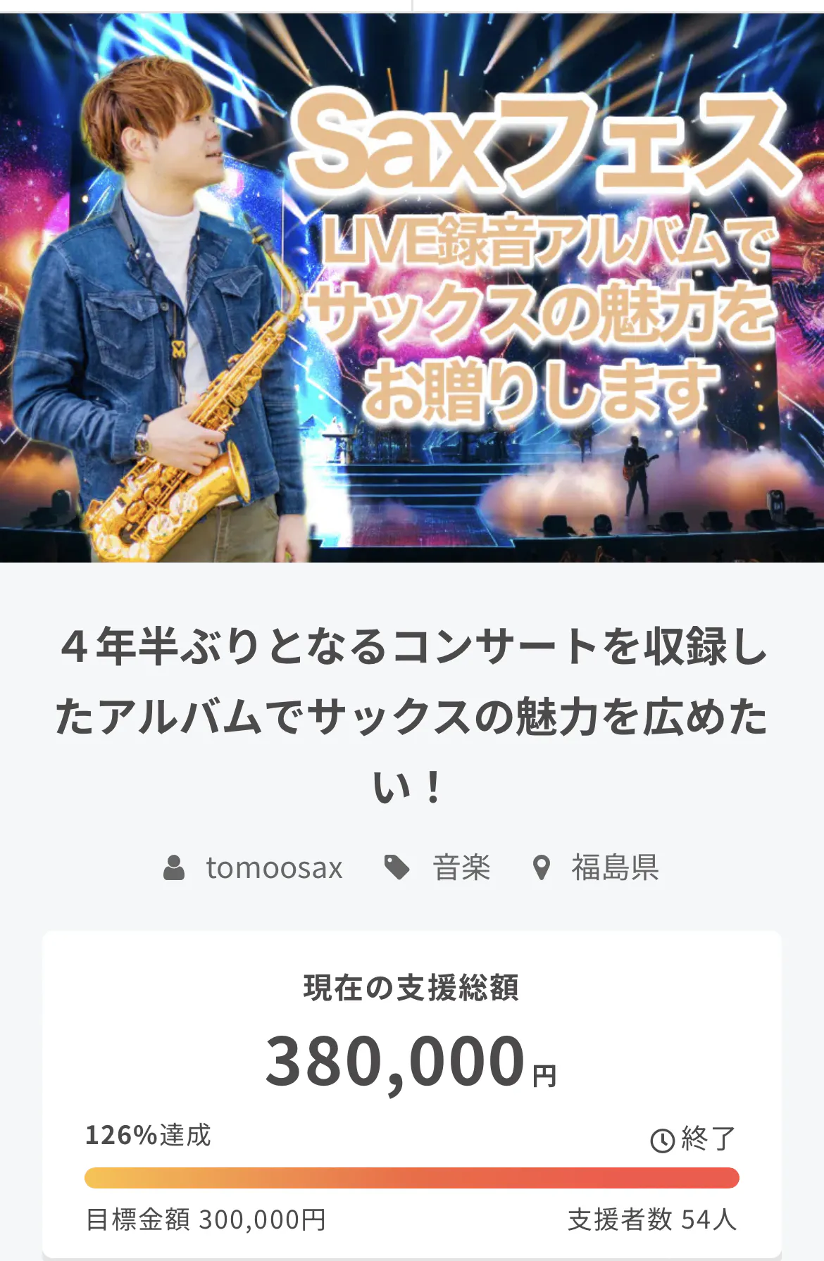 2024/03/01 13:12昨日2024年2月29日をもちまして、クラウドファンディングを終了いたしました!沢山のご支援をいただき本当にありがとうございます!おかげさまで達成率126%、支援者54名という大成功で終えることができました。こんなに沢山の方に支えられてくださる皆様がいることに、驚きと感謝で胸がいっぱいです。サックスを吹いてきてよかったなとしみじみ思いました。これからCD制作をし、出来次第リターンとして、皆様に御礼をお届けできればとおもっております。これからもどうぞよろしくお願いいたします。ありがとうございました! もっと見る