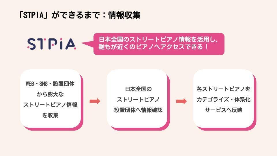 現状のSTPIAは、日本全国にあるストリートピアノの設置情報・設置団体様からの公式コメント・口コミ等の機能が御座います。全てのストリートピアノ設置団体様に対して、地道にご連絡をして、情報を連携しております。