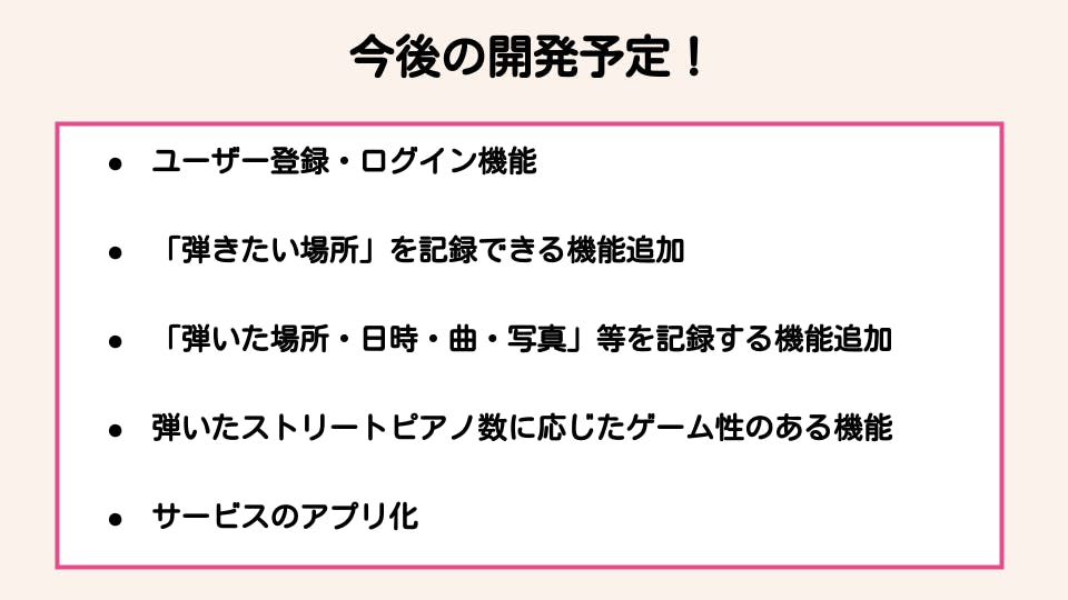 また、県内全てのストリートピアノを弾いた人に、限定バッチをプレゼントする、などのゲーム性を持った機能を追加することにより、さらなるストリートピアノの発展に貢献できると考えております。