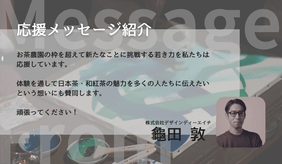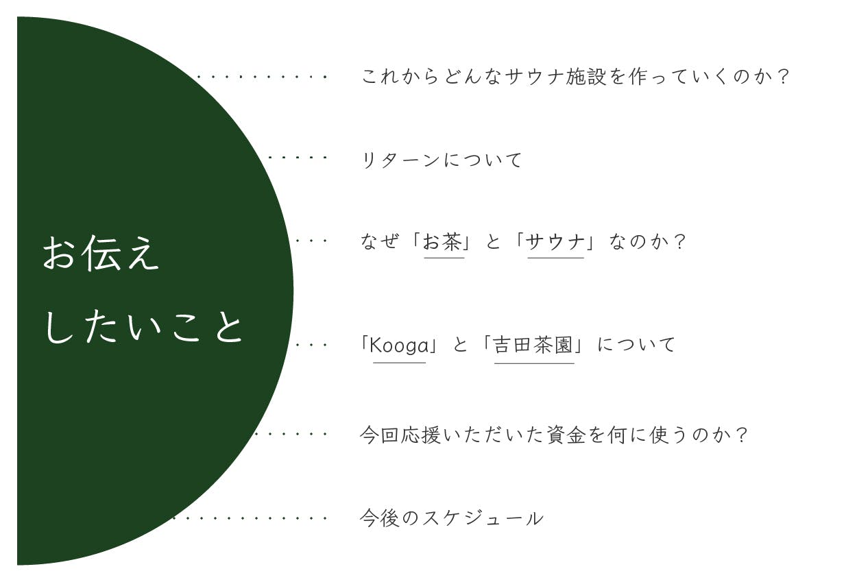 茨城県古河市にある創業1839年の老舗茶農家「吉田茶園」に日本では珍しい茶園に隣接した『お茶サウナ施設』を立ち上げます。日本茶業界・サウナ業界を盛り上げるため、地域を盛り上げるため、そして日本茶とサウナの魅力をもっと多くの方に知って頂くため、精一杯尽力していきます!応援よろしくお願いいたします!