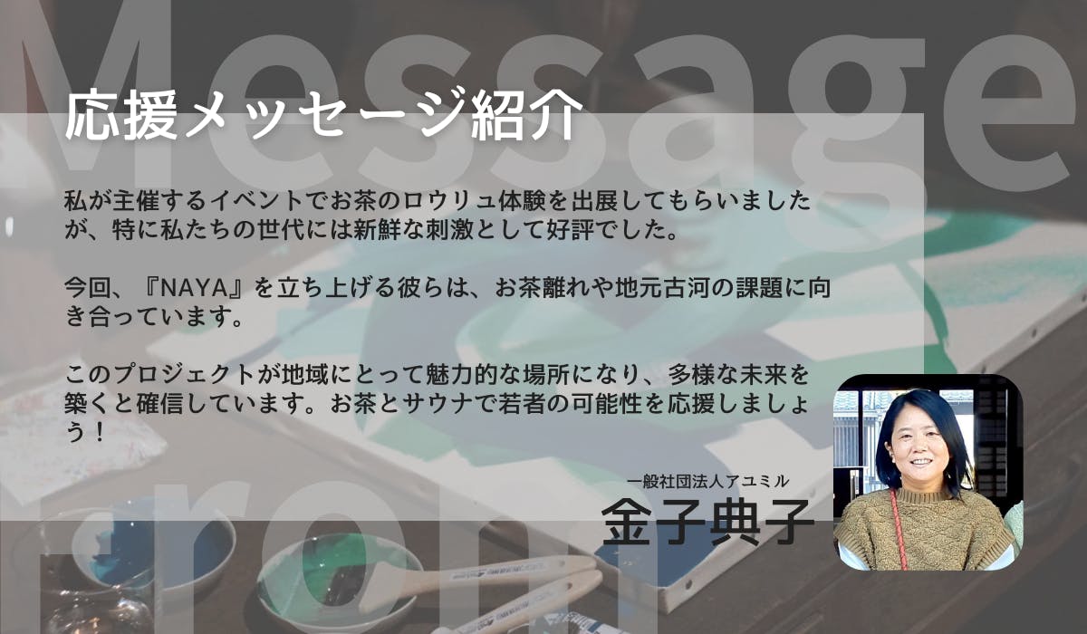 『NAYA』に来ていただければ、絶対に日本茶の面白さや可能性を感じていただけますし、新しいサウナの楽しみ方も見つかります!「お客様」であるというのはもちろんなのですが、同時に“お茶とサウナを楽しむ仲間(茶ウナー)”としても皆さんにお会いできたら嬉しいです。