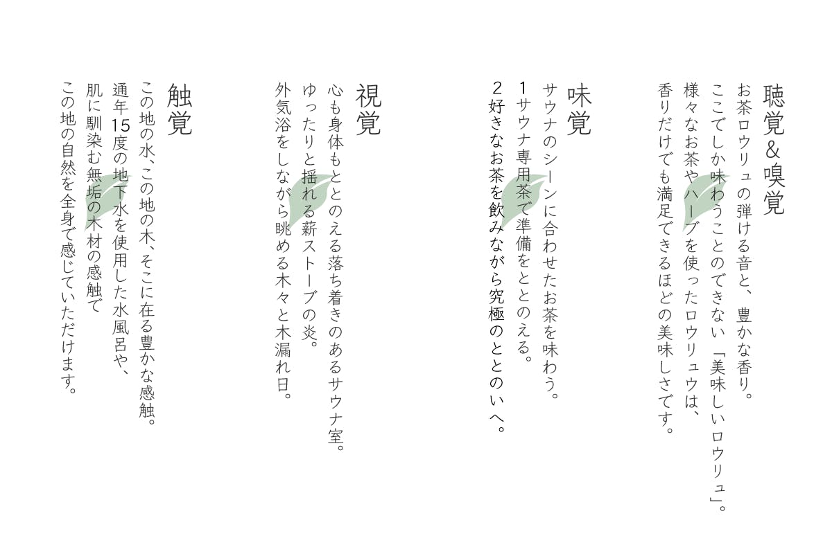 老舗茶園が織りなすお茶の豊かな香りや味わい、自然、文化などをサウナを通して丸ごと味わっていただけます。