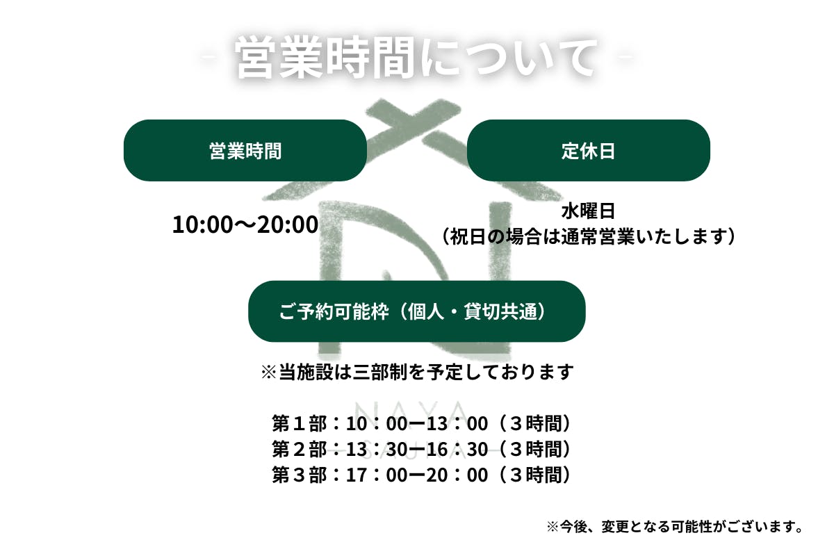なによりも、「最高だった!」「また行きたい!!」と思っていただけるような場所とサービスをNAYAメンバー一同精一杯作ってまいりますので、ぜひとも応援のほど、よろしくお願いいたします!