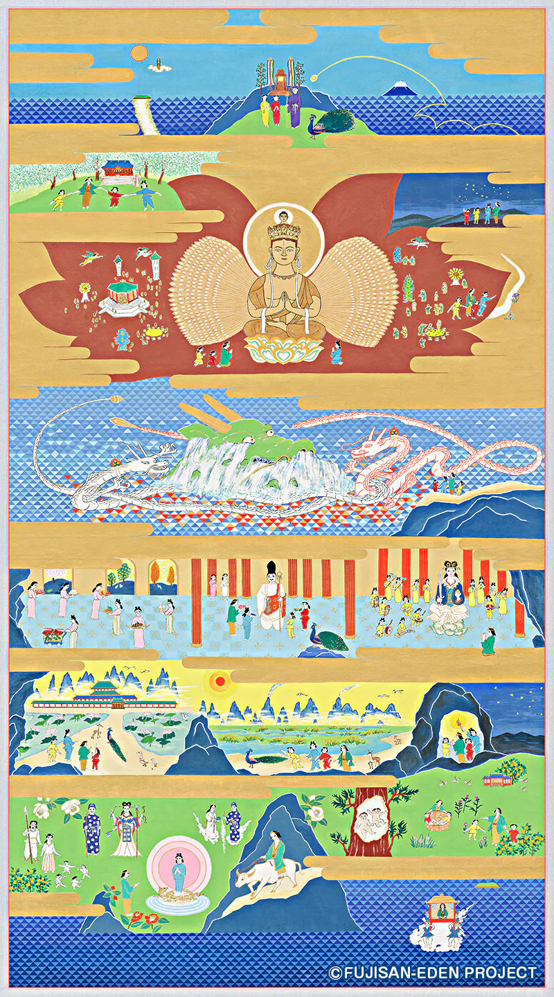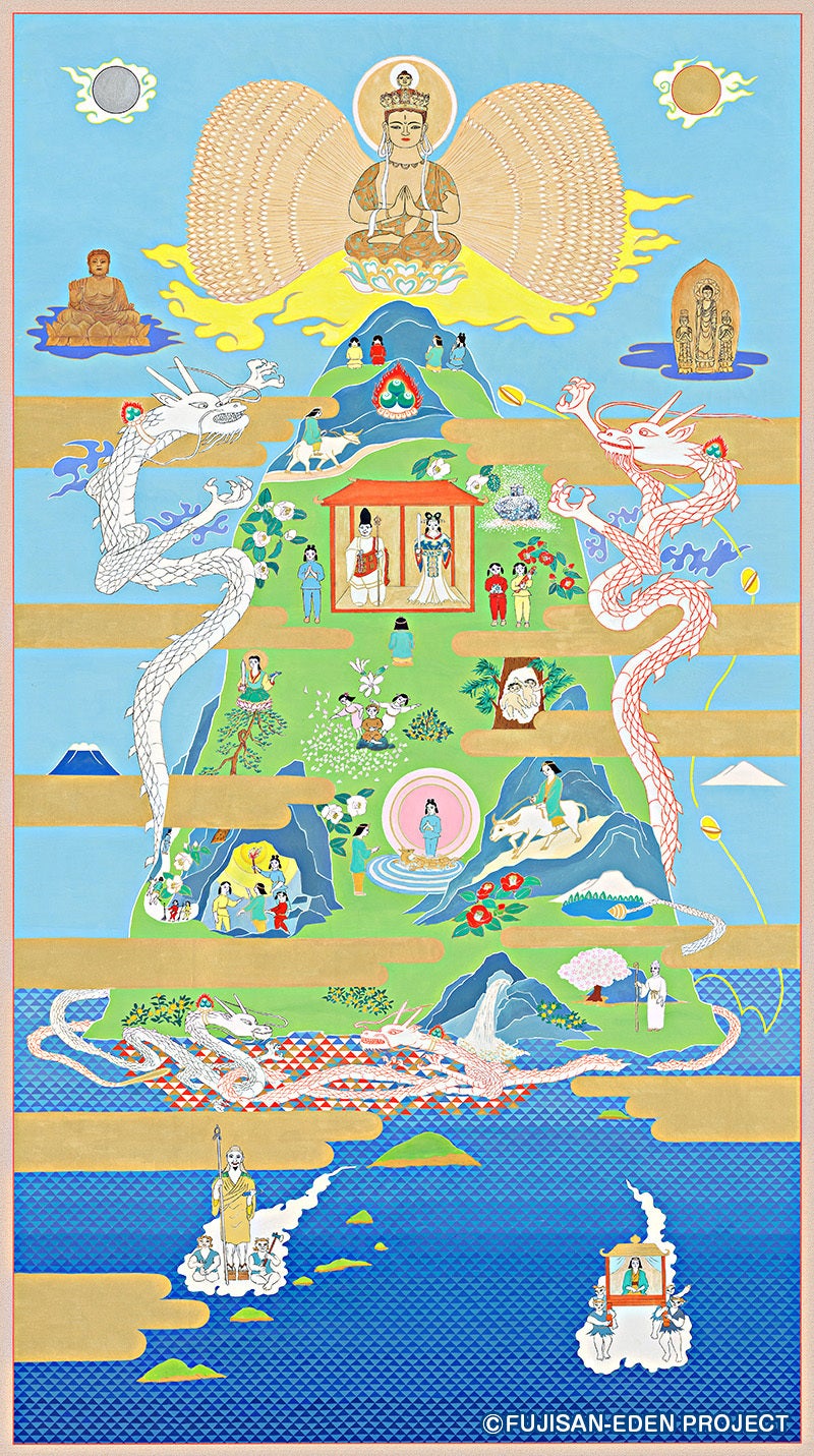 富士山が"信仰の対象"のはじまりとなった、静岡県熱海市にある伊豆山神社の走湯山縁起(そうとうさんえんぎ)という書物をもとに描かれています。この絵解きでは、赤白二龍の火と水の力で温泉が湧く、地球の神秘に触れることができます。