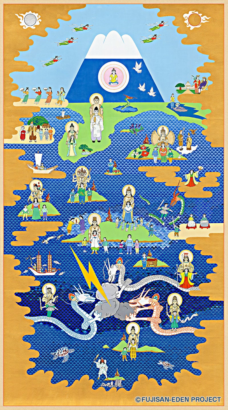 インドの王子が富士山を目指してやって来て、伊豆の海に島々を焼き出す伊豆諸島創生の物語です。伊豆諸島における古事記とも呼ばれています。龍神たちに頼んで、海中より取り出した大きい石を三つ置き、火の雷で島を焼き出す水火(すいか)の雷(いかづち)のシーンは迫力満点です。この絵解きを知れば、あなたも富士山の神さまの"ほんとうの姿"に出会えるかもしれません。