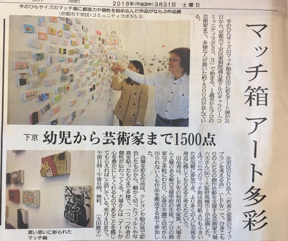 その時集まったマッチ箱の数は1500個。それぞれに描かれた絵はとても楽しい絵で見ていて飽きもしないですし、笑顔になれます。その展示の様子をこのマッチ箱アートに参加された障がいのある方、高齢者、子どもたちが連日見学に来られとても素敵な笑顔になりました。これらの様子は京都新聞、サンケイリビング京都にも紹介していただきました。