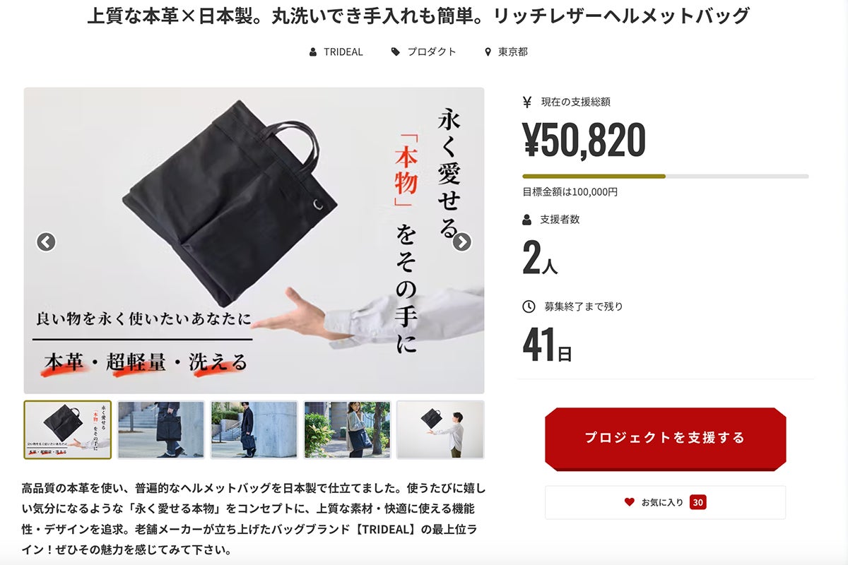 machi-ya、CAMPFIREユーザーの皆さま、こんにちは!TRIDEAL運営チームです。本日プロジェクトの最終日になりました。リッチレザーヘルメットバッグのプロジェクトは、本日の23:59までになります。