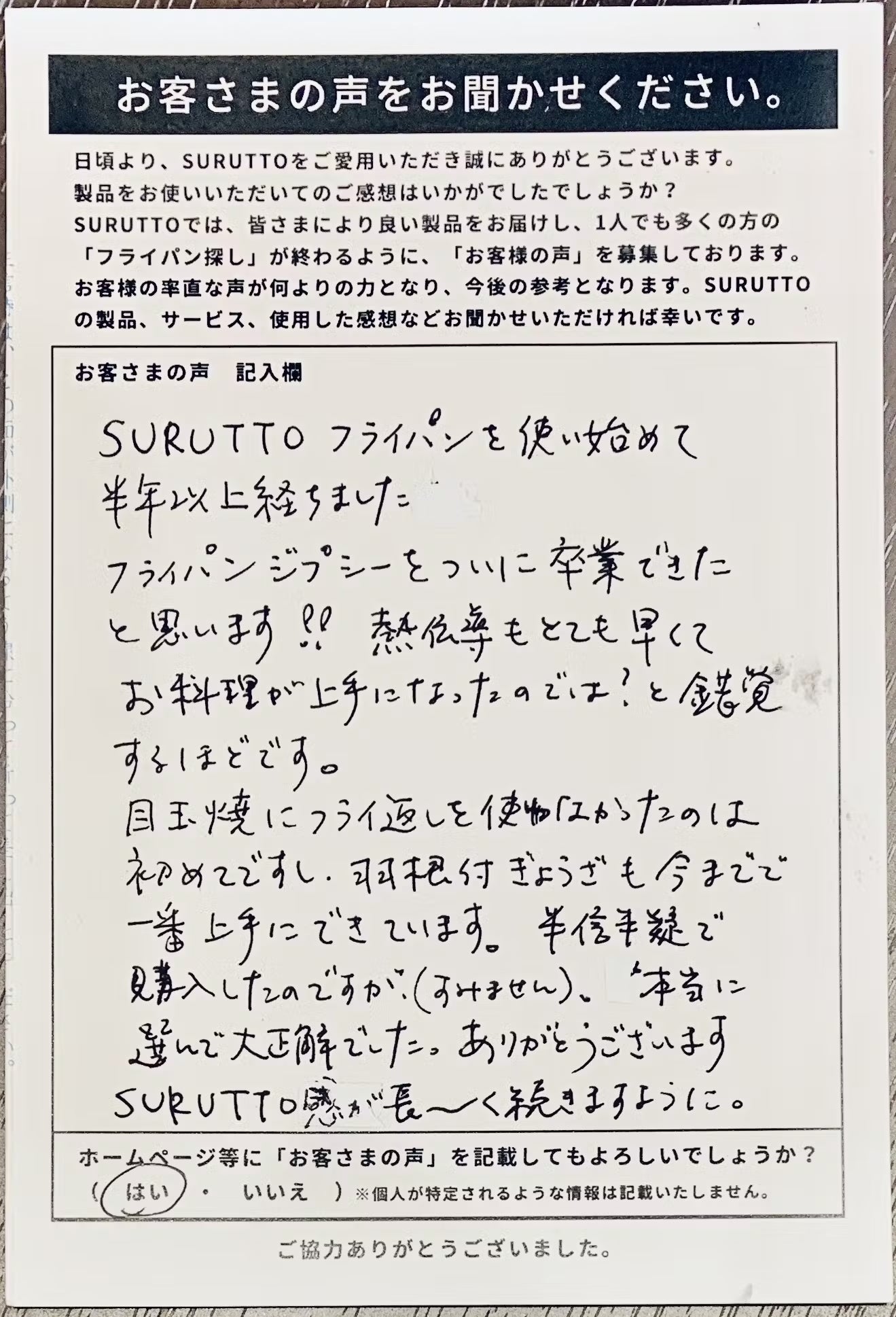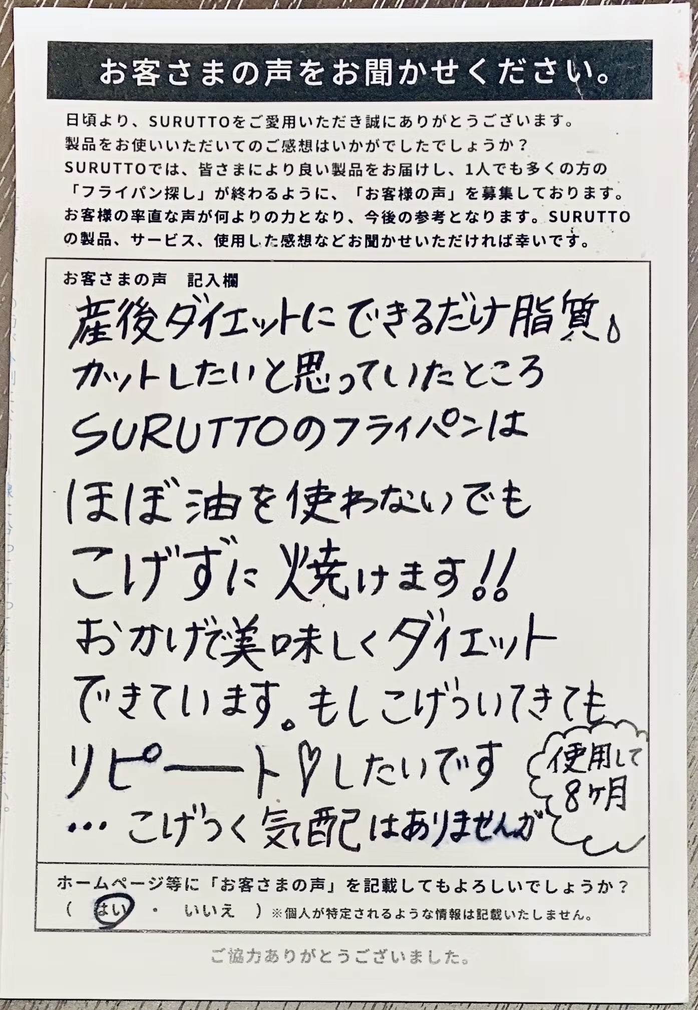 ※SURUTTOのコーティングは、フッ素塗膜加工の1種です。素材の特性上、強火や空焚きの禁止などいくつかの注意事項があります。正しい使い方は公式ホームページにてご紹介しております。サポーターの皆さまに、より長持ちを実感していただきたいので、ぜひご覧ください。詳しくはこちら