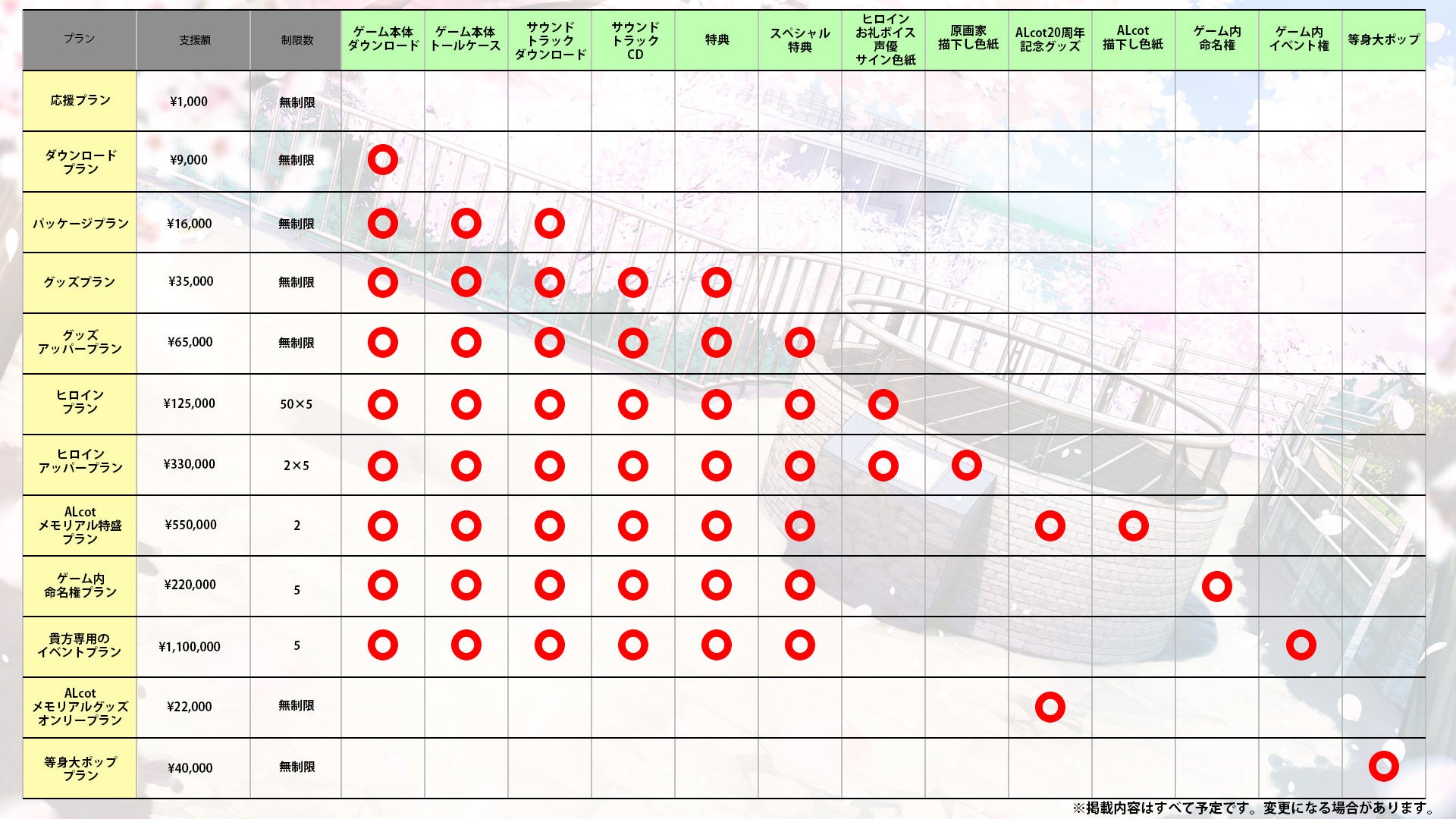 A:現状2025年11月末を予定しておりますが、状況により変動する可能性がございます。詳細な時期につきましてはプロジェクトページ内の活動報告、および「ALcot公式X(旧Twitter)」内にてお知らせ致します。