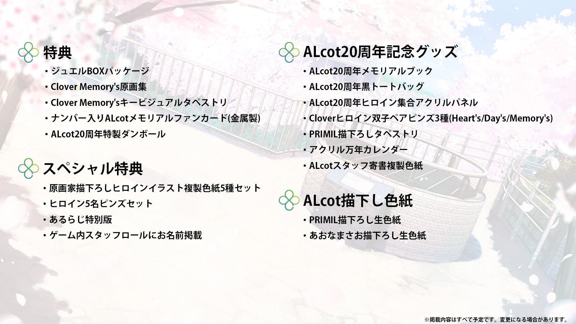 ※CFのリターン発送からひと月後を目安に一般流通で販売予定のClover Memory'sに如月勿ミニルートの内容は含まれません。