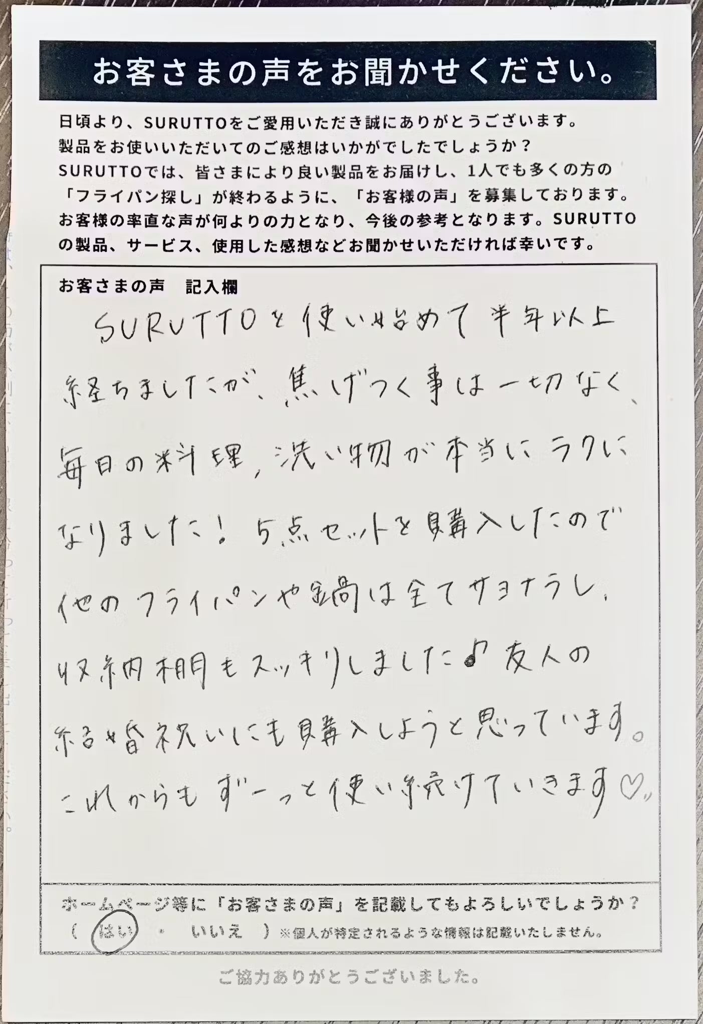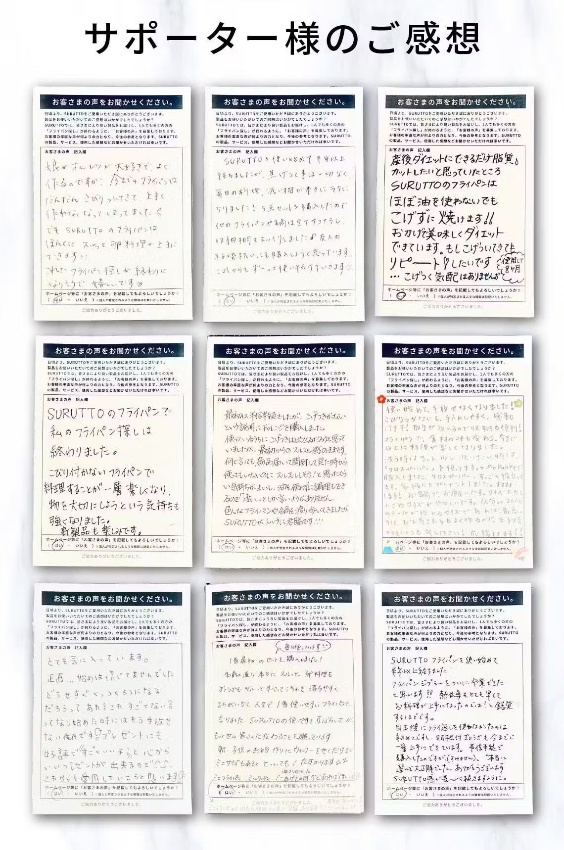 ※SURUTTOのコーティングは、フッ素塗膜加工の1種です。素材の特性上、強火や空焚きの禁止などいくつかの注意事項があります。正しい使い方は公式ホームページにてご紹介しております。サポーターの皆さまに、より長持ちを実感していただきたいので、ぜひご覧ください。詳しくはこちらです