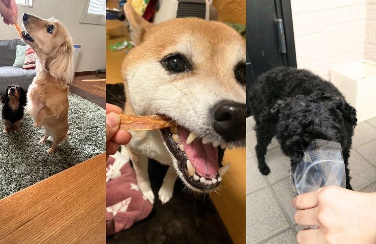 お知り合いのわんちゃんやねこちゃんにモニター協力いただいていますが、みんなスモークの香りには興味深々!くんくんしておいしく食べてくれているようです(^^)