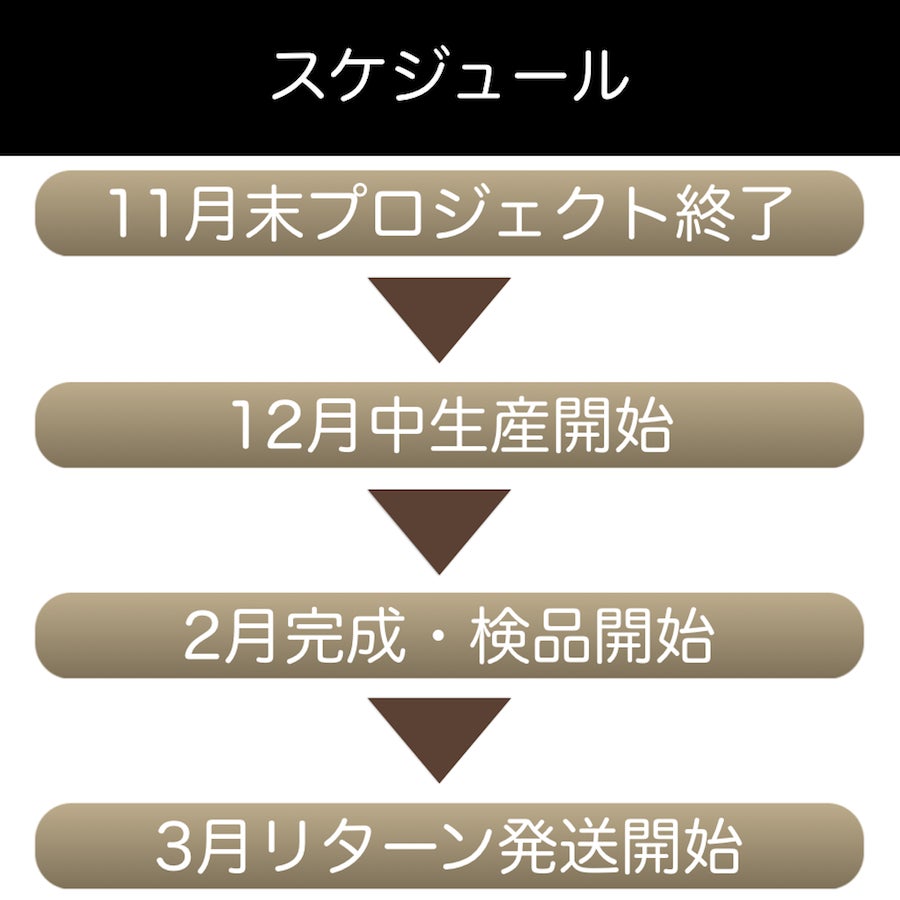 ※本文中に記載したスケジュールについては、あくまでプロジェクト公開時点の予定となります。ご支援数などが想定を上回った場合や、製造工程上の都合や工場の状況等により出荷時期が遅れる場合がございます。