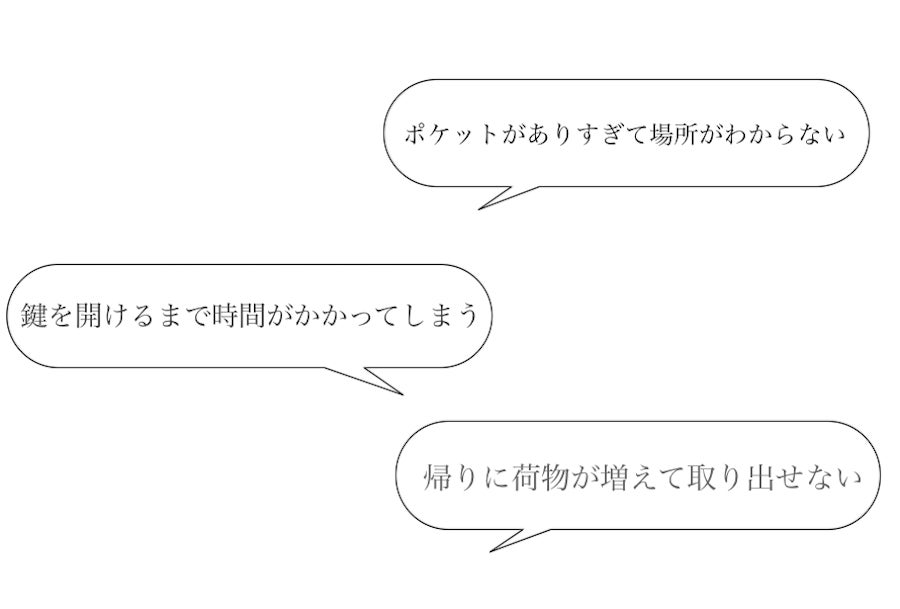 ポケットが多いバッグはどのポケットに入れたかわからなくなり、帰りに荷物が増えて鍵がバッグ底にあり取りにくくなってしまったり。。