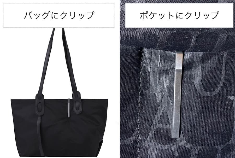外出する時は、鍵をつけたバッグキークリップCURIPPOをバッグのポケットに挟むだけ。