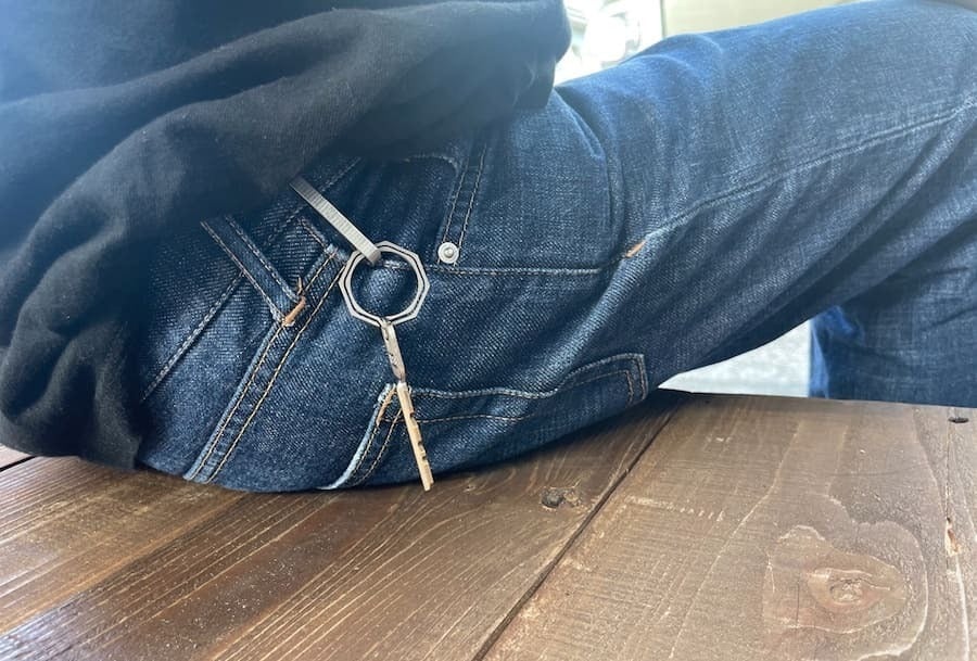 バッグだけでなくパンツのポケットにもつけられます。様々なポケットと合わせることが可能です。