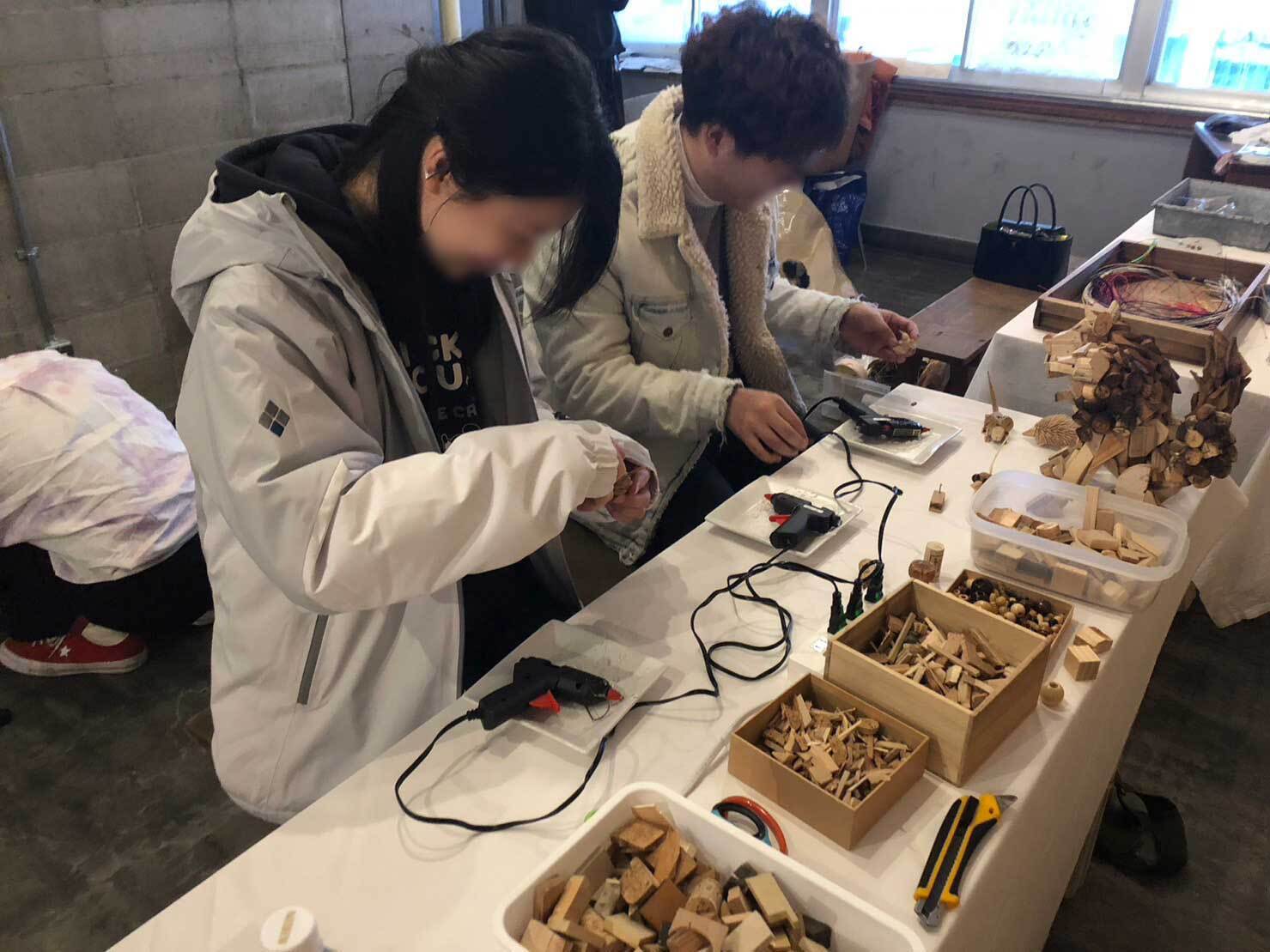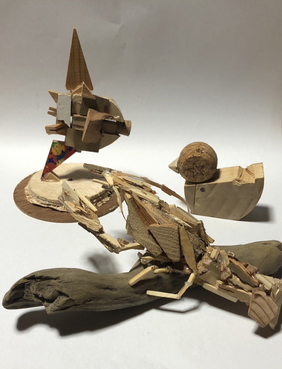 廃材を思い思いにグルーガンで接着。縦に横にいろんな作品が作れますね。