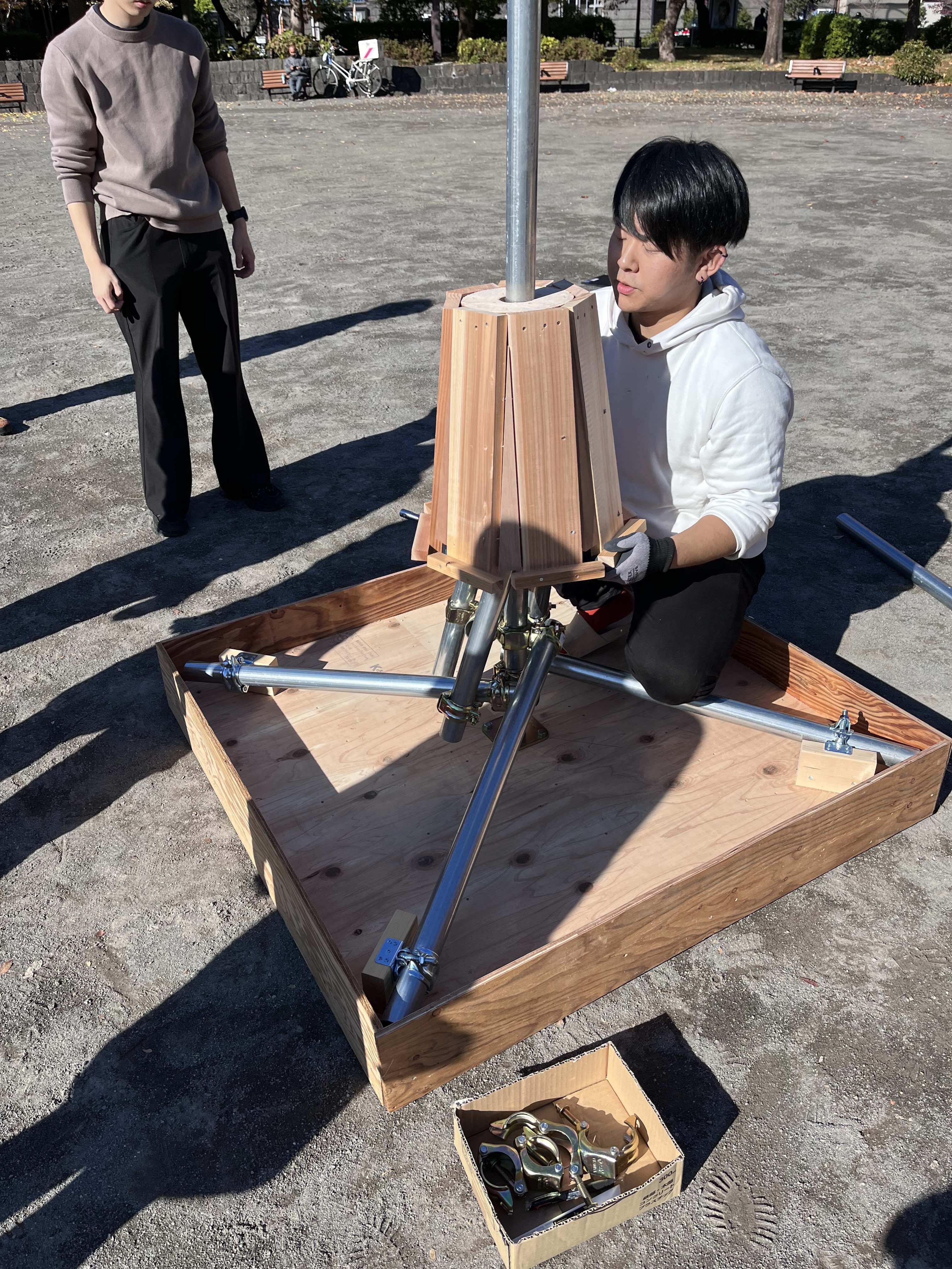 最初は、加治さんがツリーの中心を設置する姿を見守りました。