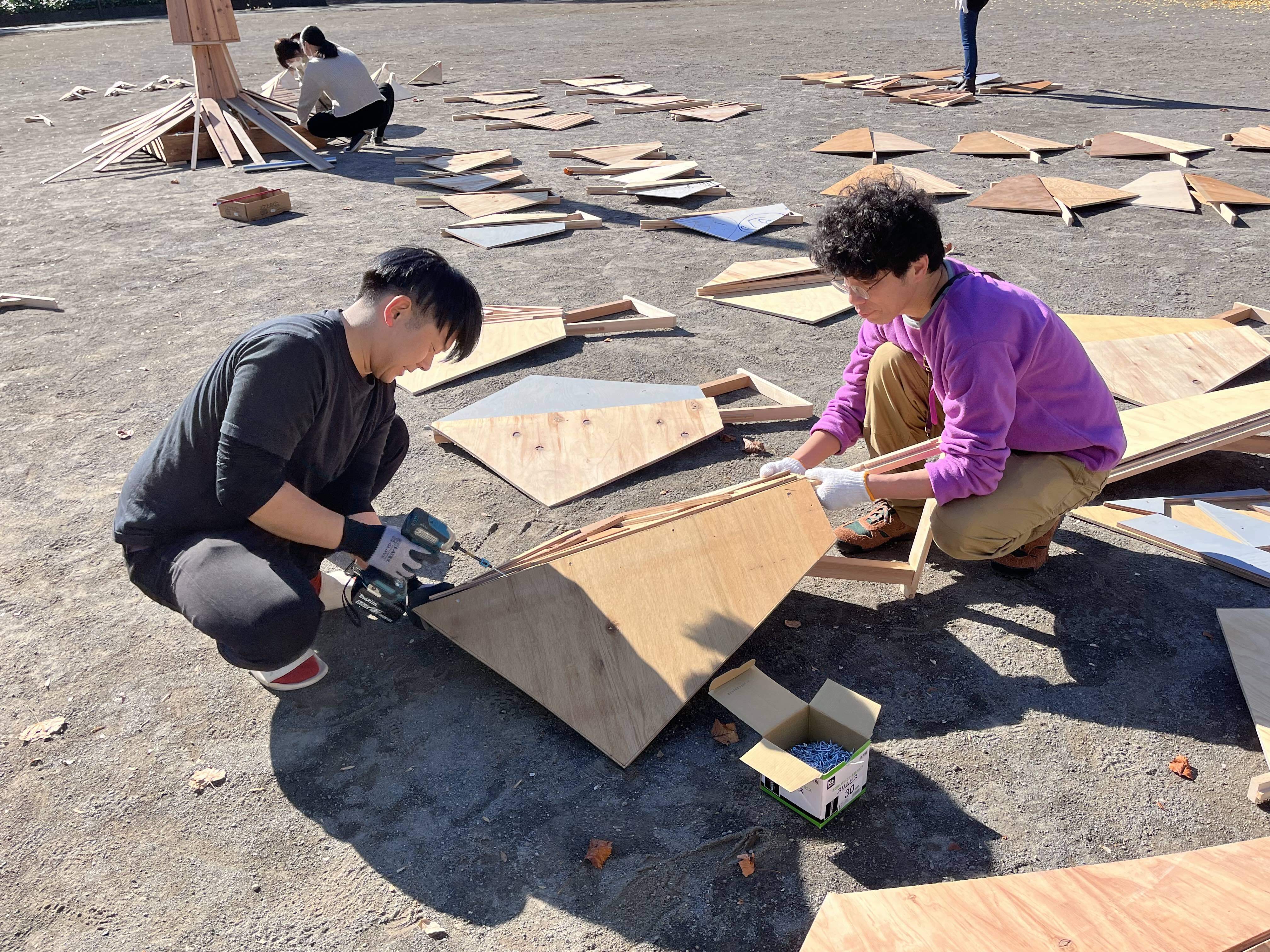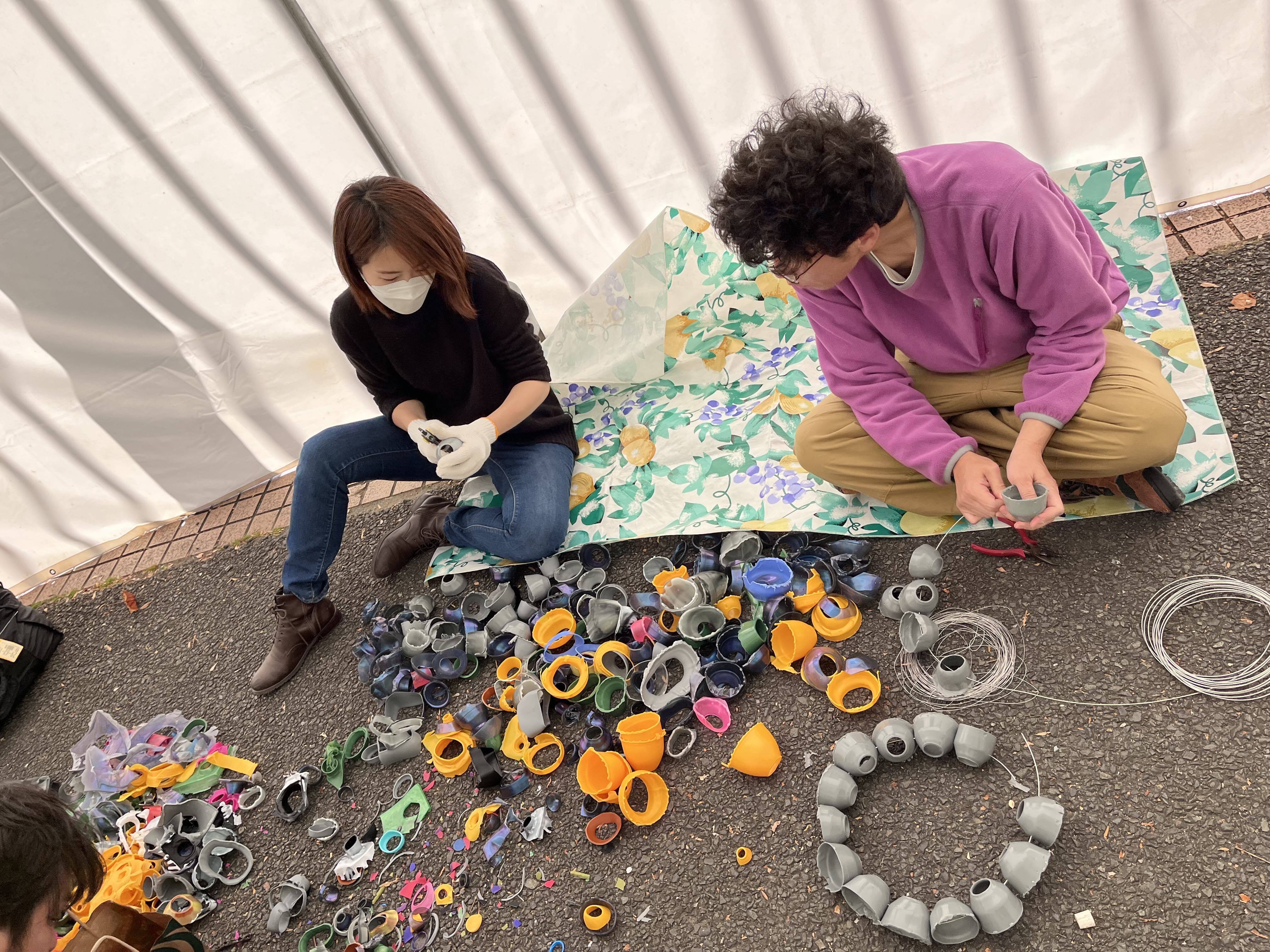 片桐さんと加治さんがツリーの葉っぱの部分を作成!