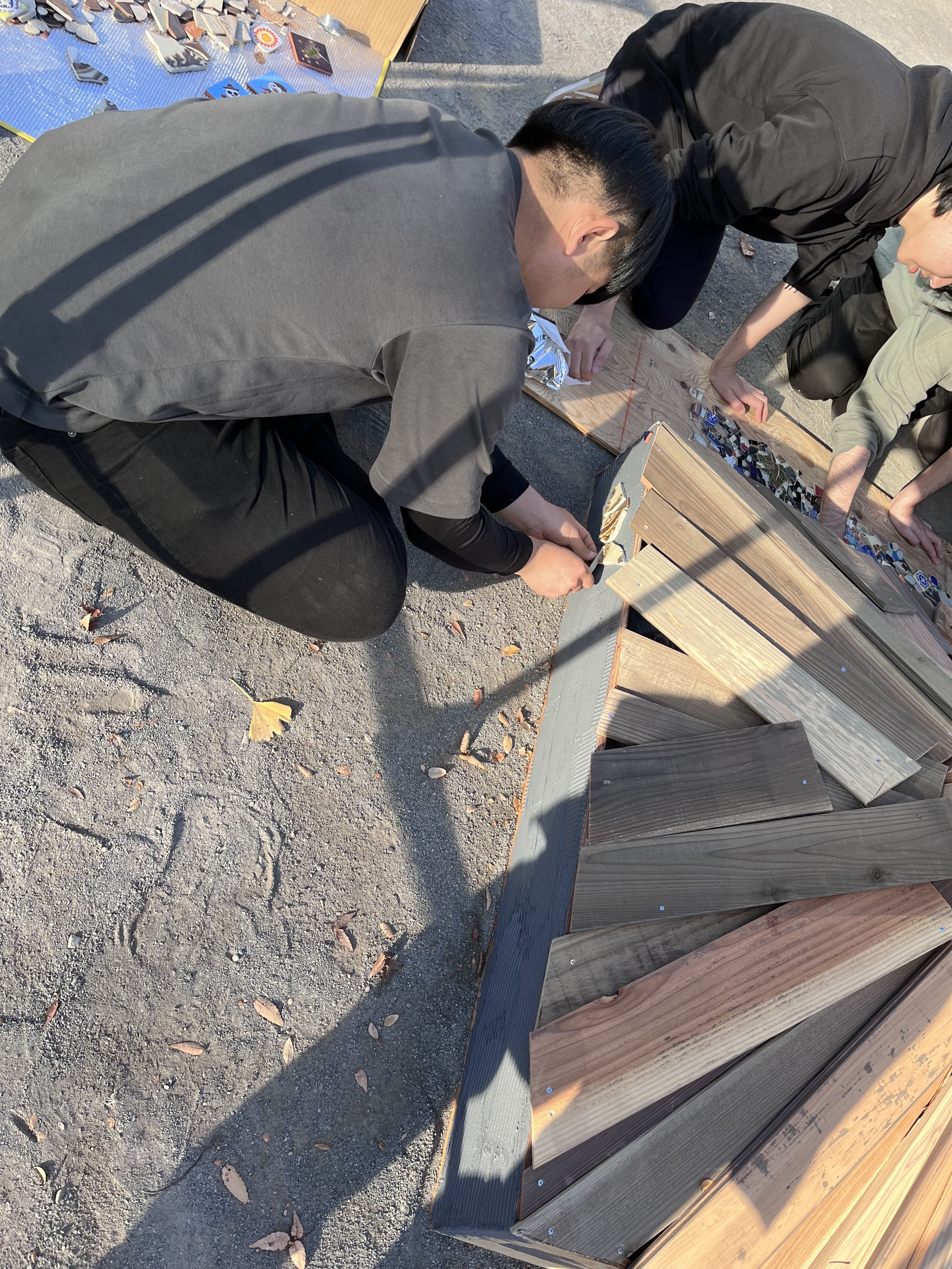 クラウドファンディングのご支援でご参加いただいた皆様や美大生やサポートの皆様と一緒に、ツリー制作が進んでおります。お天気にも恵まれた二日間、絶好のタイル貼り日和です。