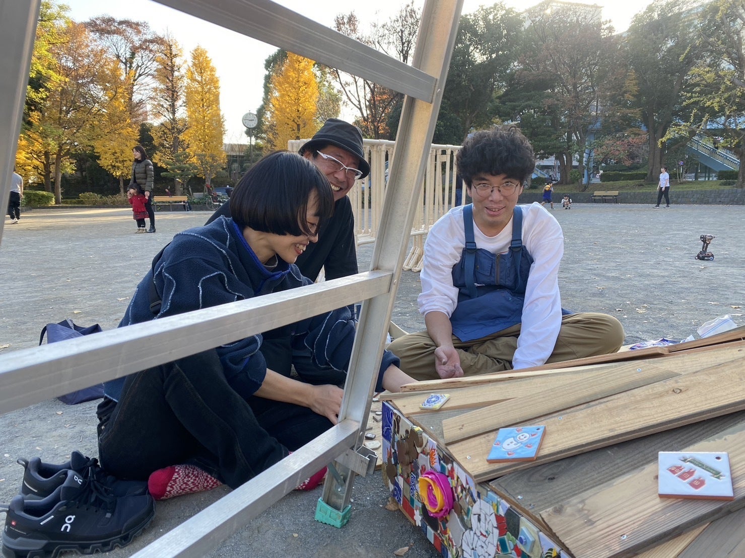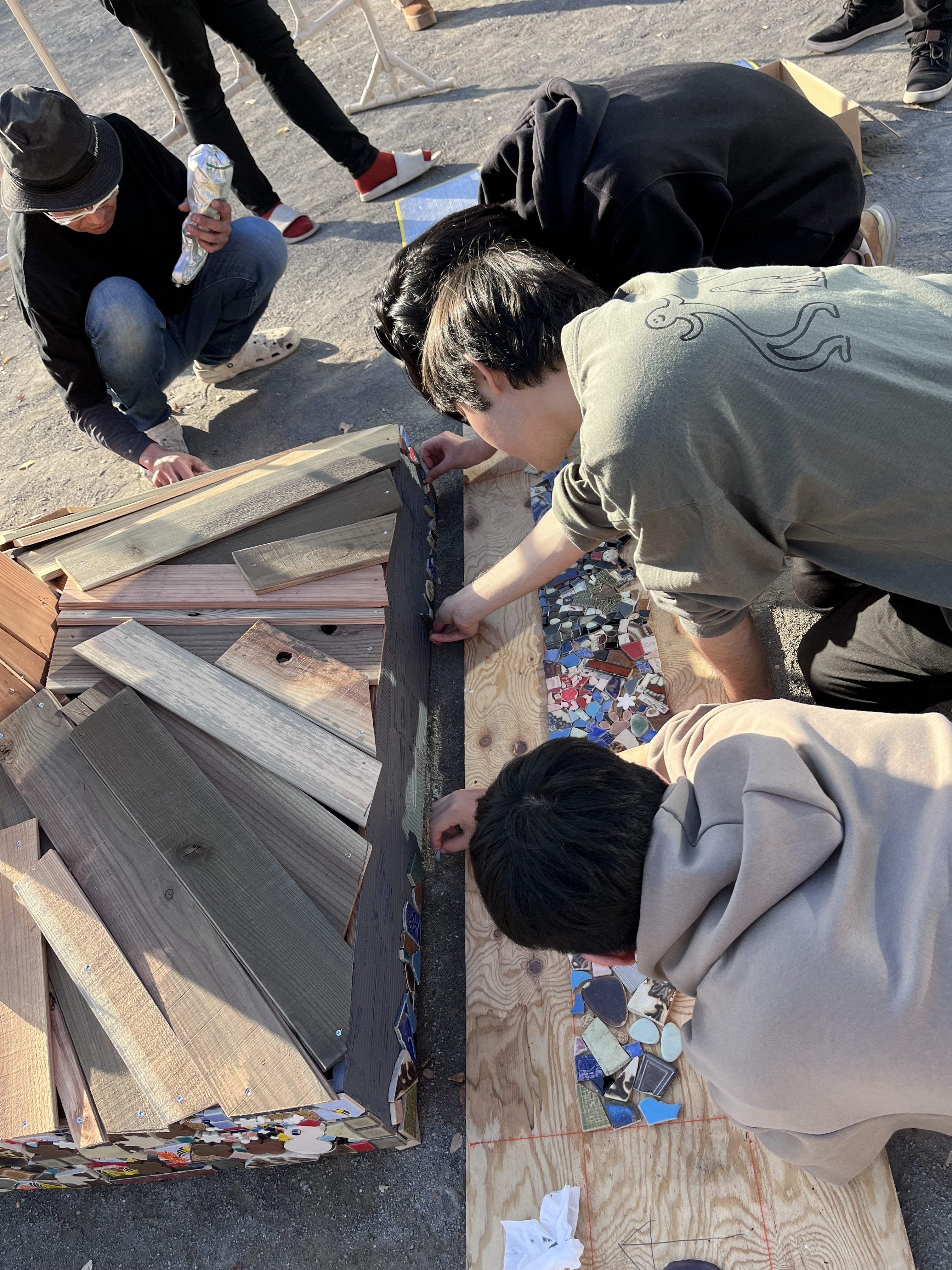 加治さん、片桐さん&KiNaKoさん&クラファンのご支援の皆様、土屋さん&ふじたさん、チーム美大生3人組、の4チームでアートツリーの土台にタイルを貼りました。